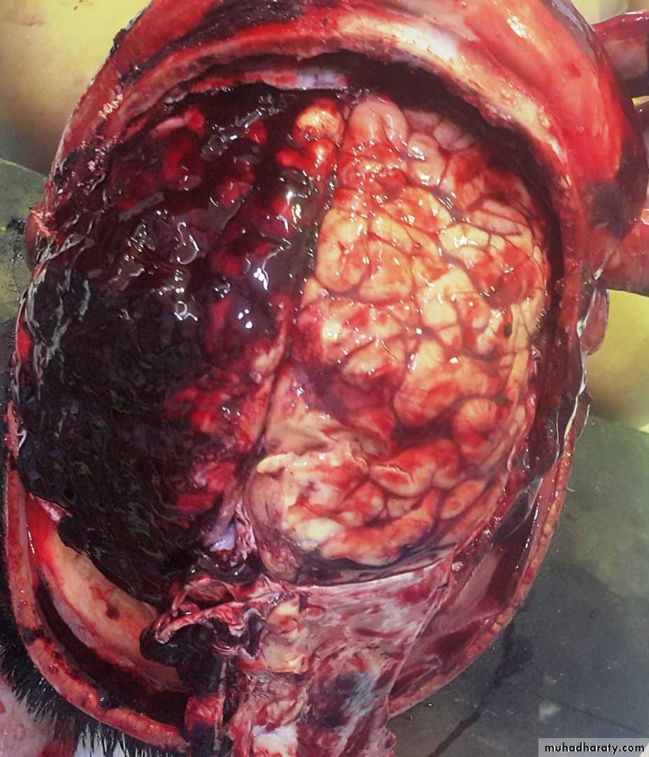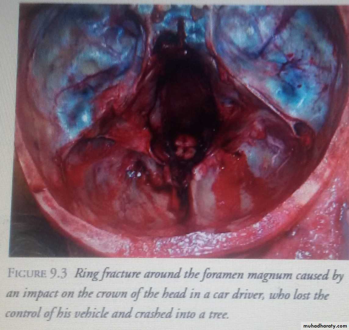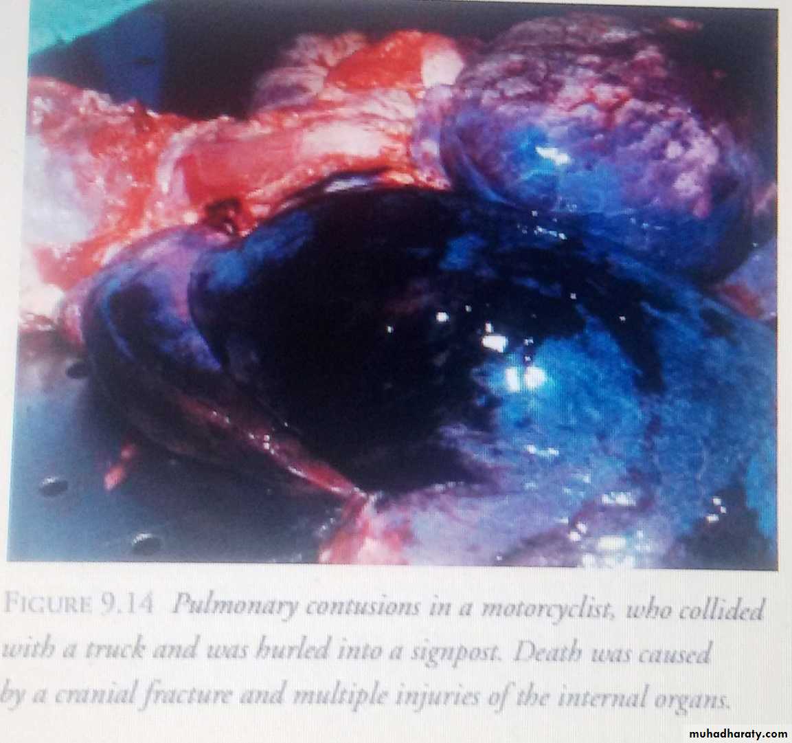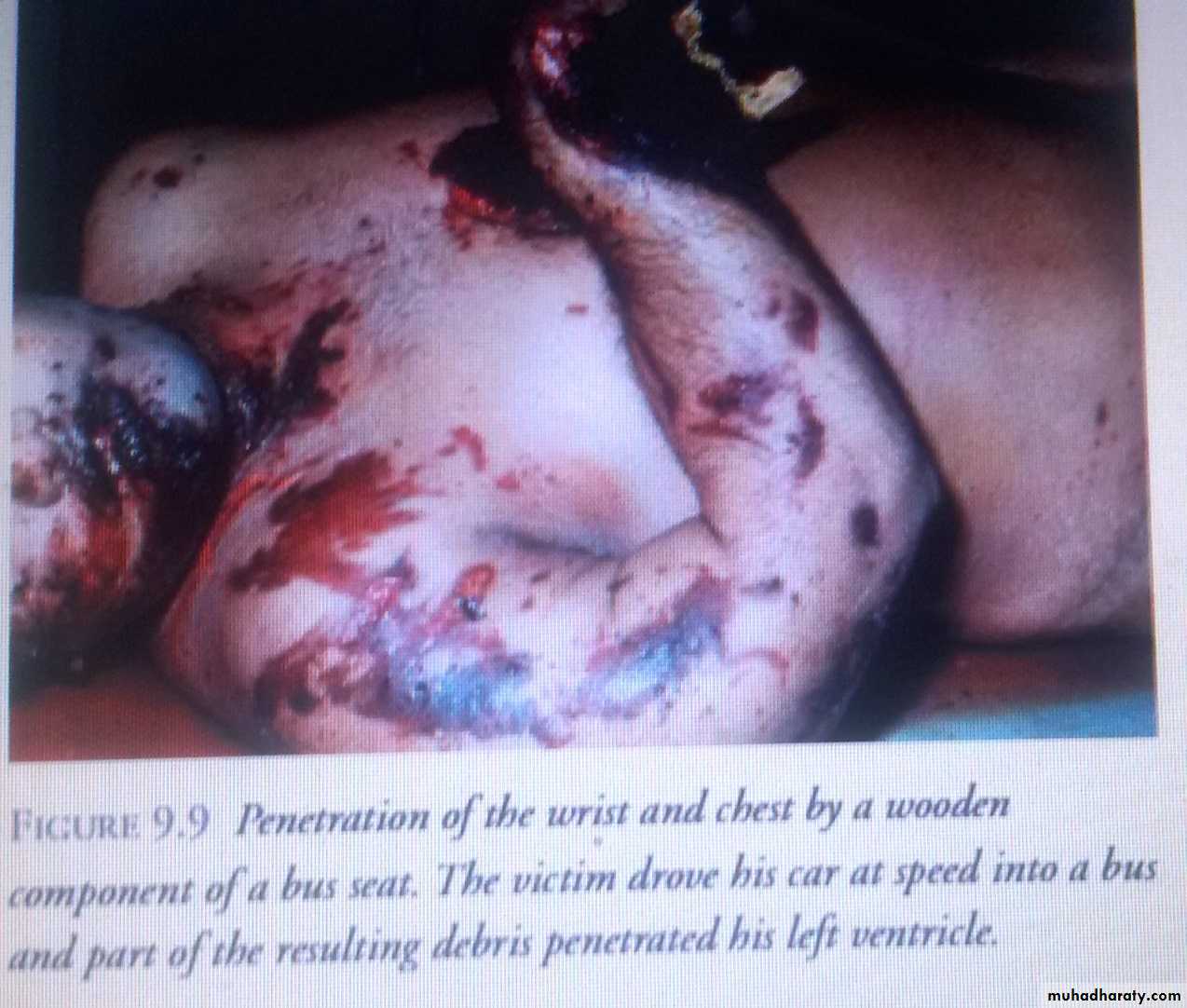 45ب ـ اضرار واقية الريح الامامية :ـ تصنع الواقية من زجاج ينكسر عند الصدم الى شضايا دقيقة ذات اشكال هندسية رباعية لاتتجاوز ابعادها 1 سم . لذا فعند الكسر في حوادث الاصطدام تصيب هذه الشضايا مقدم الوجه بسحجات ختمية متميزة تاخذ اشكال الشظايا الزجاجية. وعند عدم تكسر واقي الريح فيفضي الامر الى كسور في عظام الانف او القوسين الوجنين او العظم الجبهي . وفي الحالات الاشد تحصل اضرار سحائية دماغية مختلفة الدرجات اعتمادا على شدة الصدم .