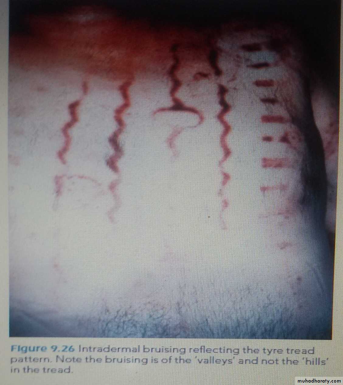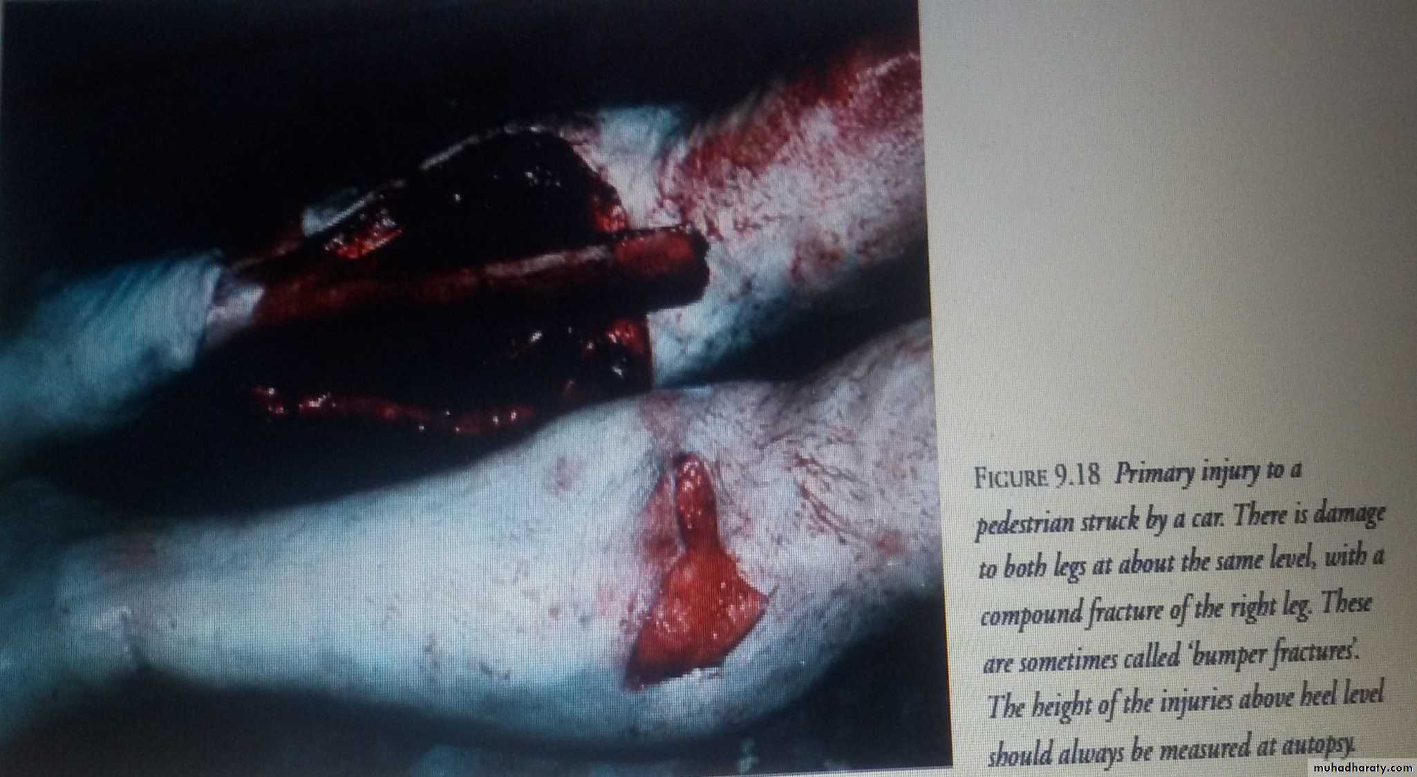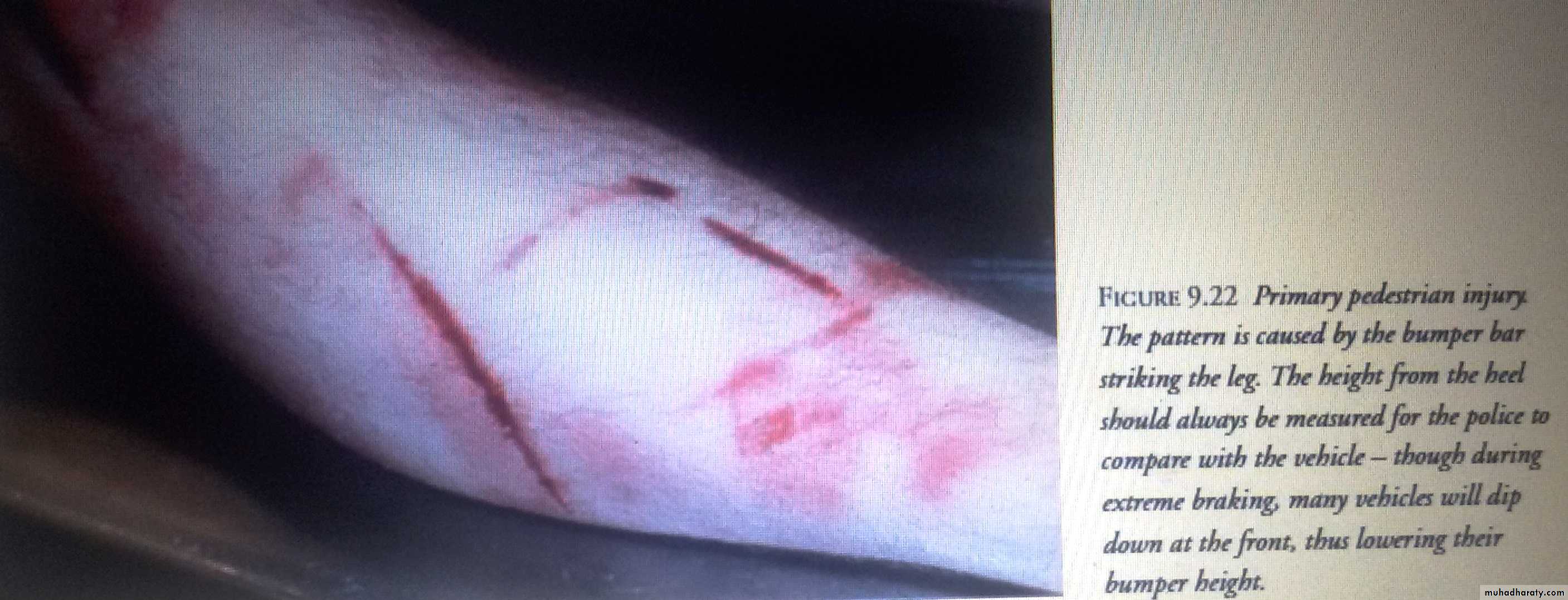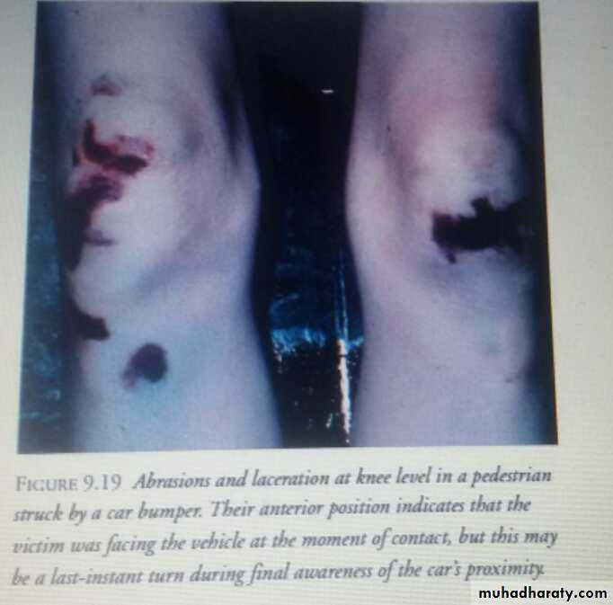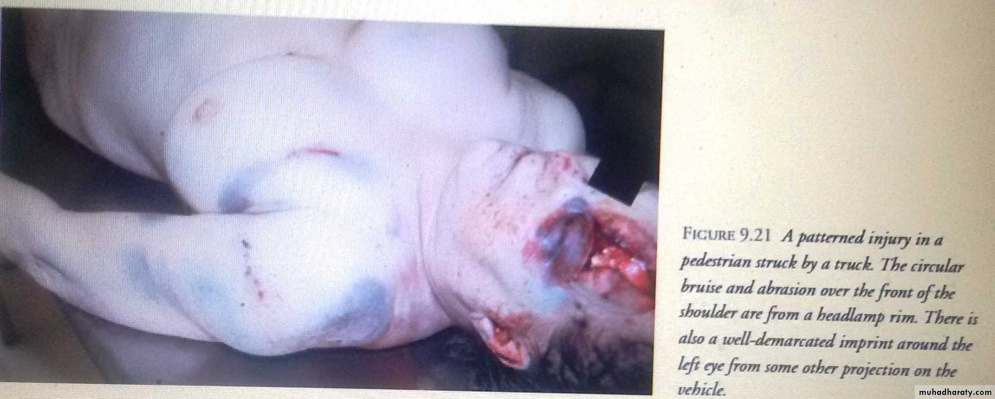 27كشطية اذا كانت منقطة الصدم بالارض عارية من الملابس, اما انطباع اثر عجلة السيارة على الجسم عند مرورها على اي جزء منه فيكون على هيئة كدمات ختمية تشابه او تكون طبعتها تشابه الجزء الذي سار على الجثة, ويمكن الاعتماد على طراز توزيعها في معرفة العجلة ومن ثم السيارة الداعمة, فيما يلي الكدمات الختمية للعجلة توجد جروح رضية سحقية واضرار حشوية او كسور عظمية اعتمادا على ثقل السيارة وسرعتها . اما سحل المصاب فيؤدي الى سحجات كشطية, وقد تتعرى العظام نتيجة حصول جروح رضية اذا بقيت الجثة مسحوبة مسافة طويلة. يجب بان يتذكر الطبيب ان مرحلة الصدم عند الاطفال تؤدي الى حدوث سحجات ختمية اعلى مما عند البالغين, فتكون هذه اما بمستوى الظهر او الراس, اما رمي الاطفال فيكون الى الامام , اما في مرحلة مابعد الرمي فلاتختلف الاضرار عند الصغار عن تلك التي تصيب البالغين .