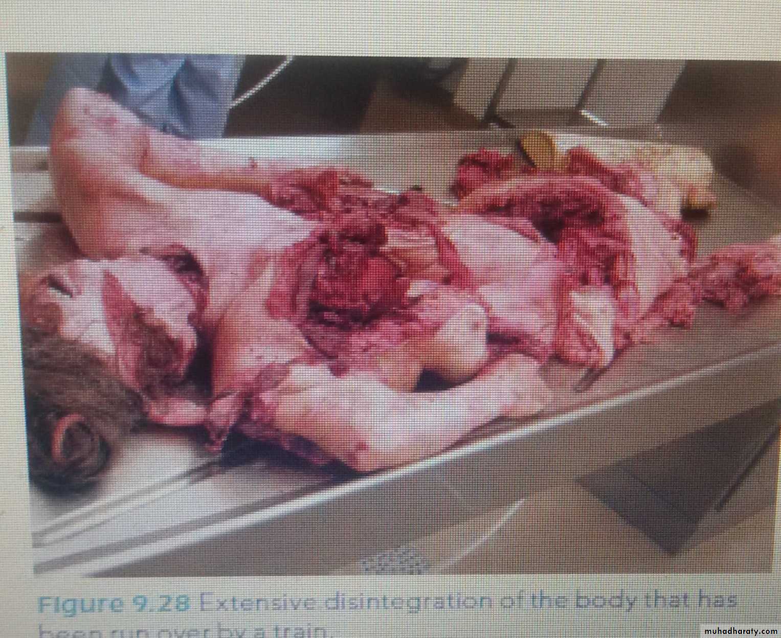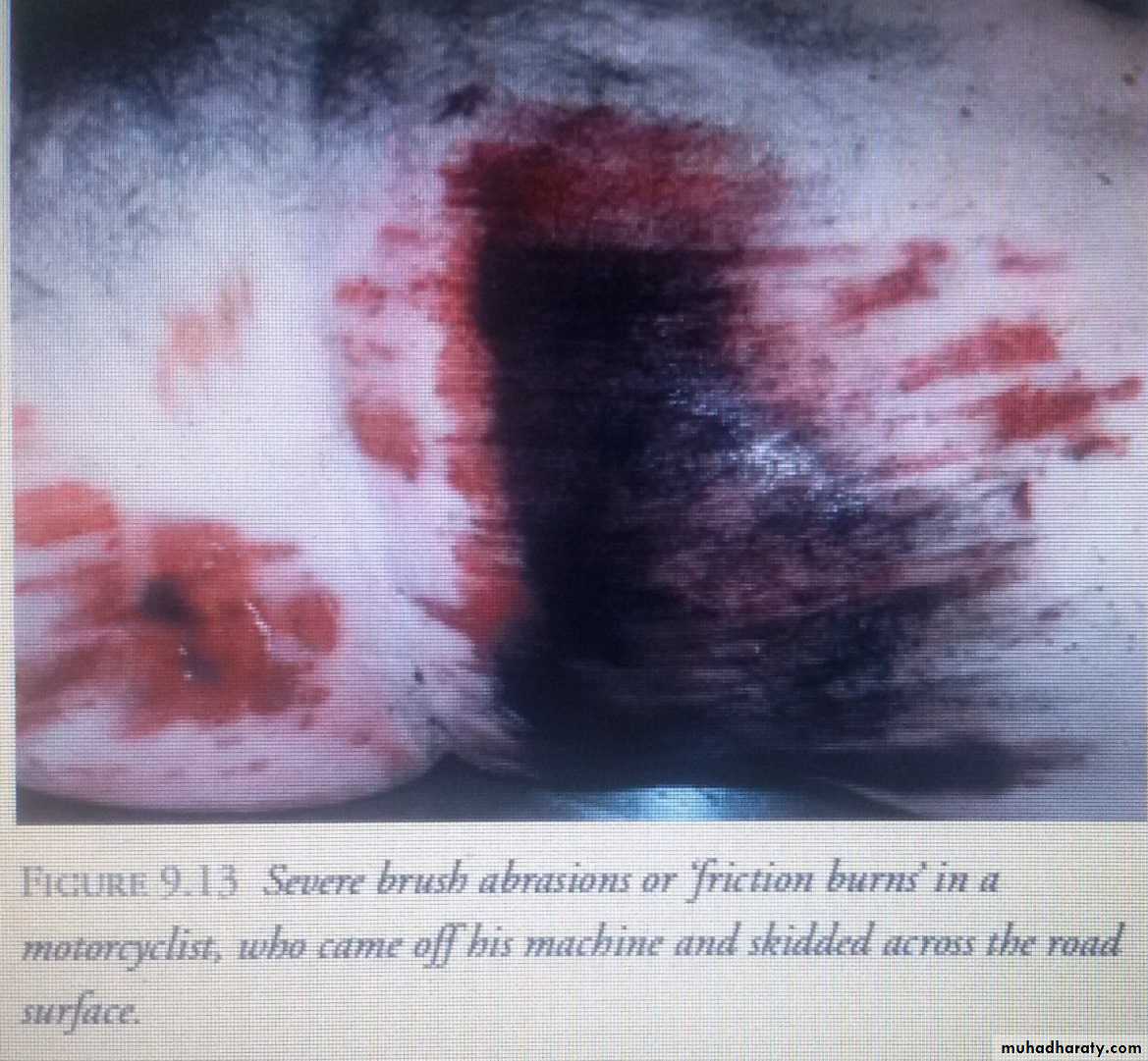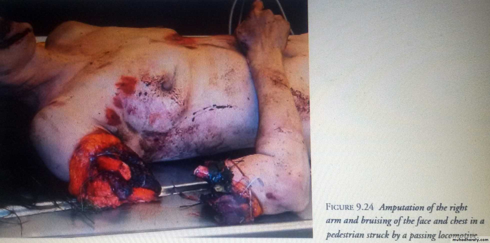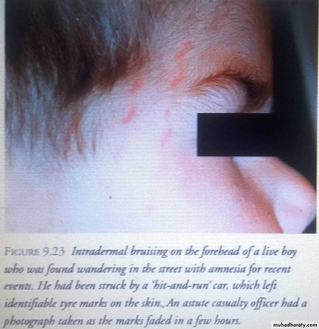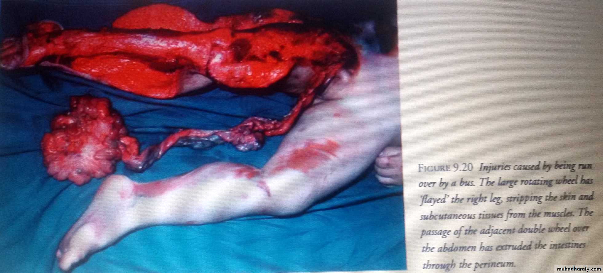 27كشطية اذا كانت منقطة الصدم بالارض عارية من الملابس, اما انطباع اثر عجلة السيارة على الجسم عند مرورها على اي جزء منه فيكون على هيئة كدمات ختمية تشابه او تكون طبعتها تشابه الجزء الذي سار على الجثة, ويمكن الاعتماد على طراز توزيعها في معرفة العجلة ومن ثم السيارة الداعمة, فيما يلي الكدمات الختمية للعجلة توجد جروح رضية سحقية واضرار حشوية او كسور عظمية اعتمادا على ثقل السيارة وسرعتها . اما سحل المصاب فيؤدي الى سحجات كشطية, وقد تتعرى العظام نتيجة حصول جروح رضية اذا بقيت الجثة مسحوبة مسافة طويلة. يجب بان يتذكر الطبيب ان مرحلة الصدم عند الاطفال تؤدي الى حدوث سحجات ختمية اعلى مما عند البالغين, فتكون هذه اما بمستوى الظهر او الراس, اما رمي الاطفال فيكون الى الامام , اما في مرحلة مابعد الرمي فلاتختلف الاضرار عند الصغار عن تلك التي تصيب البالغين .