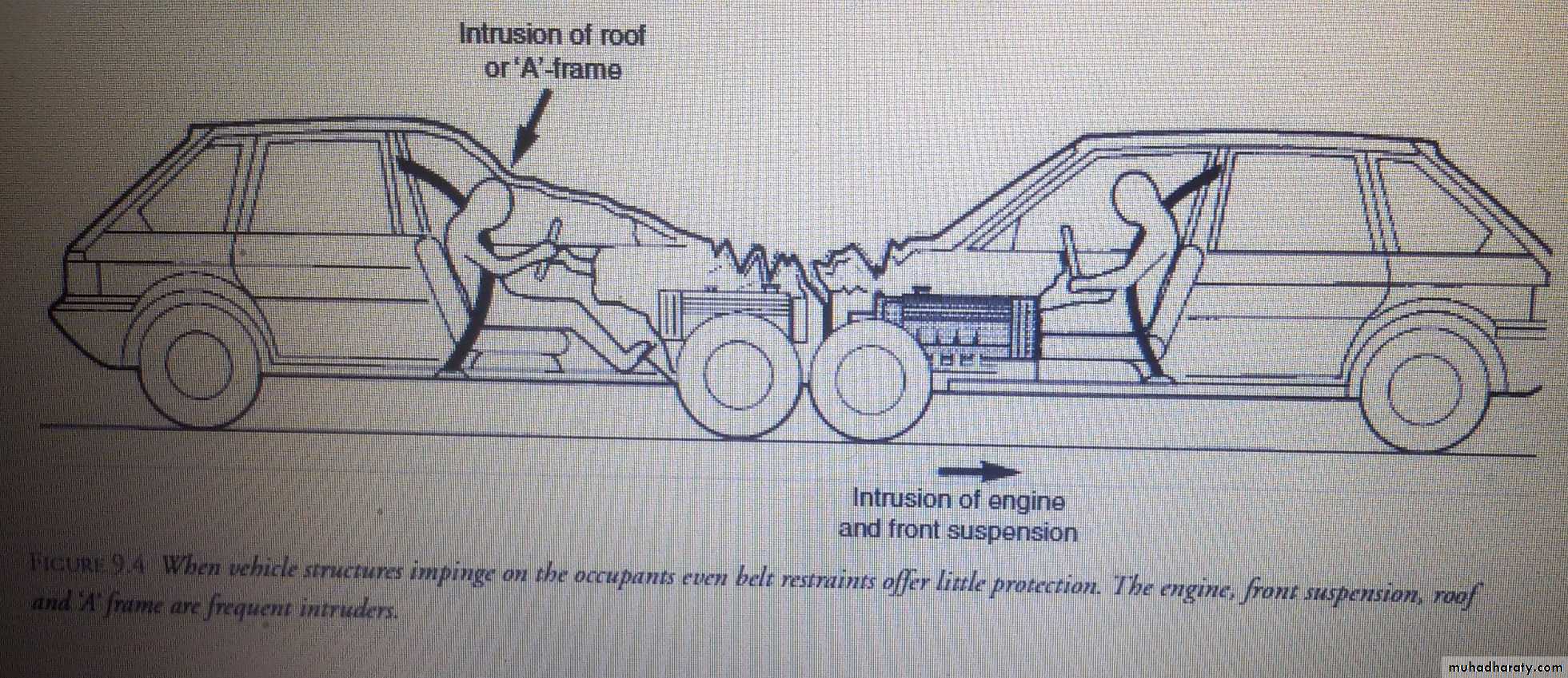 يؤدي الاصطدام الى اندفاع ركاب الواسطة الى نفس جهة سير الواسطة, فهم يندفعون الى الامام في الاصطدام الامامي فيتحركون من اماكن جلوسهم بمحصلة ان لم يكن الاصطدام بزاوية قائمة او من الجانبين . ويرتد الراكب او رأسه فقط الى الخلف في وقائع الاصطدام من الخلف . وتختلف الاضرارالتي تصيب الركاب عند الاصطدام بحسب موقع كل راكب.