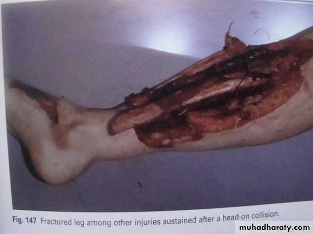46وقد يترافق ذلك بكسر الرضفة او كسر الفخذ في متوسطه او ضررفي أي من نهايته وقد يندفع راس الفخذ للخلف فيؤدي الى كسر في عظام الحوض المجاورة . في حالات الاصطدام الشديدة جدا قد تندفع ماكنة السيارة الى الداخل فيتسبب كسور في عظمي الساق .