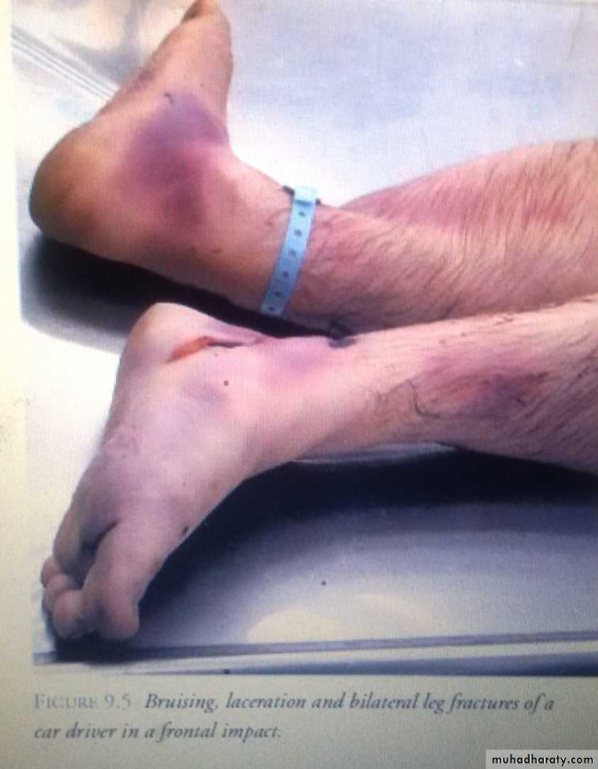 ج ـ اضرار الحافة السفلى للوحة القيادة :ـ تسبب الحافة السفلى للدشبول بسحجة او كدمة او جرح رضي في ركبة واحدة او في الركبتين