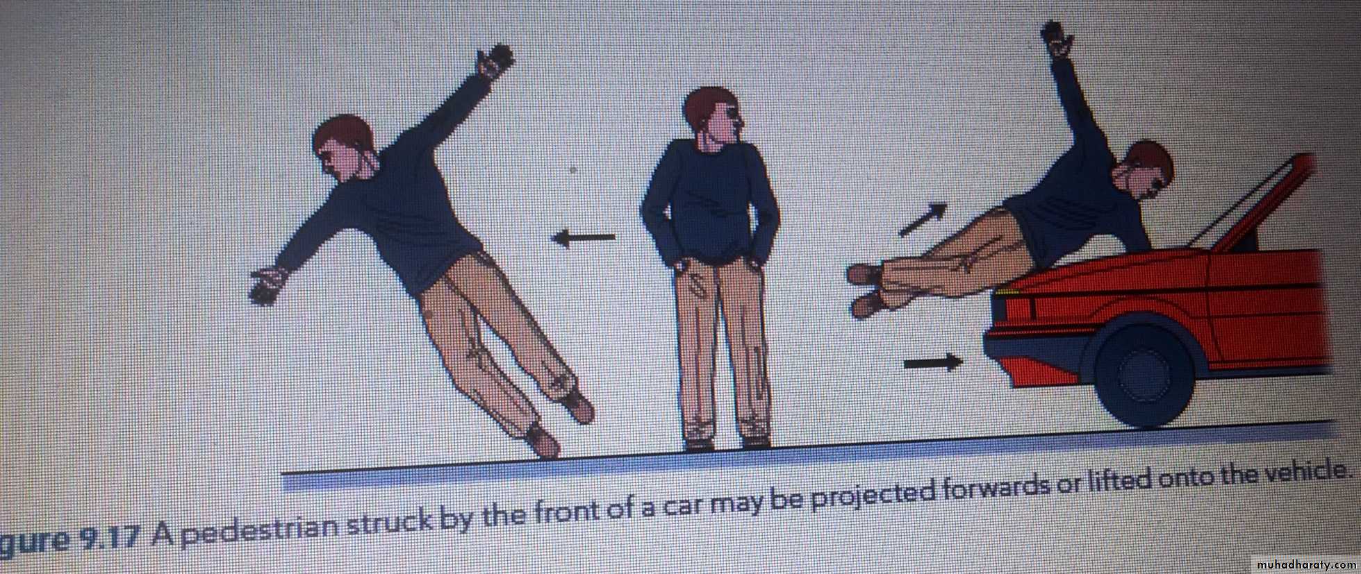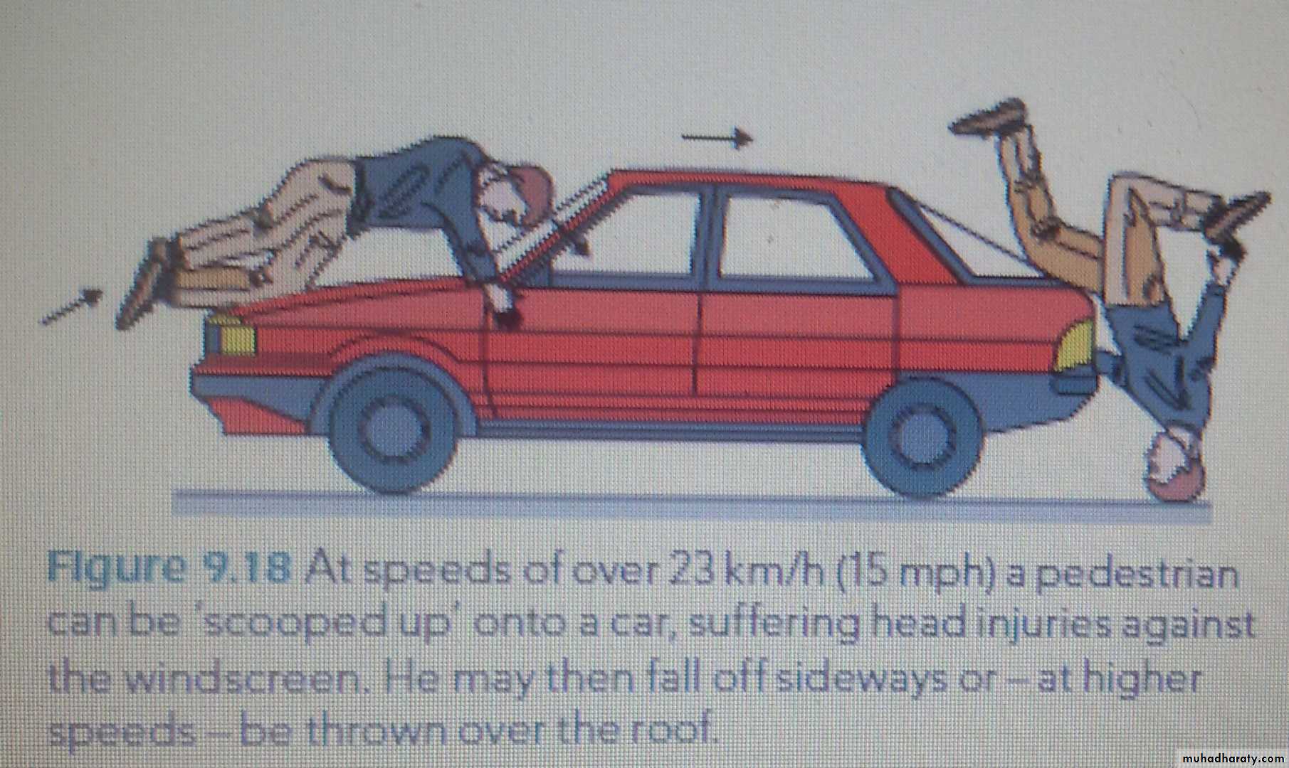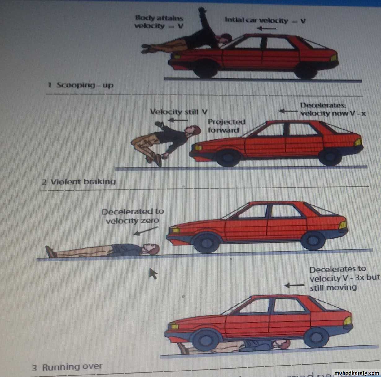 • 1ـ مرحلة الصدم الأول بين السيارة والضحية :ـ والذي يتم بين جنب الضحية ومقدم السيارة, واقل من ذلك ما يتم من الخلف أو من الإمام, وقد يكون الجزء الصادم من السيارات الدعامة فيصيب أعلى الساقين, أوالمصابيح الأمامية و إطاراتها, أو أي جزء من شبابيك جهاز التبريد فتصيب منطقة الحوض من أي جهة كانت أو أعلى الفخذ عند البالغين.