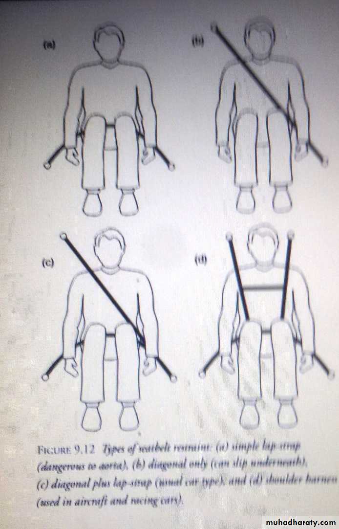 تسبب احزمة الامان عند ربطها ضررا سحجي ختمي مستعرض في اسفل البطن قد تصاحبه عند الصدم الشديد سحجات غير مباشرة في أي من المنطقتين المغبنيتين .