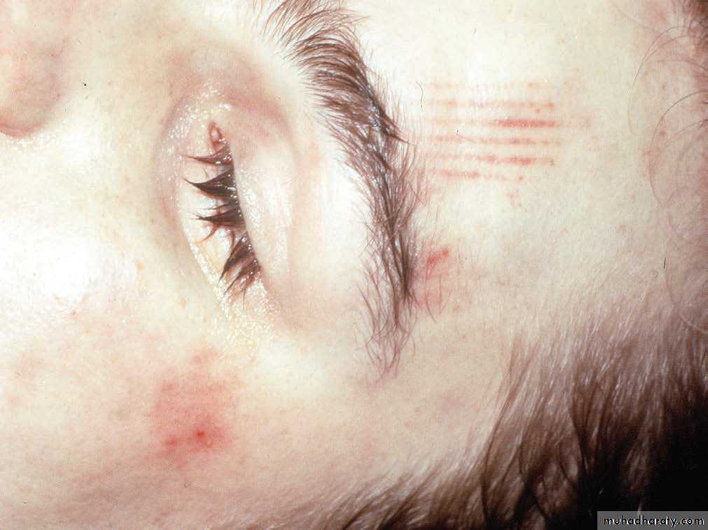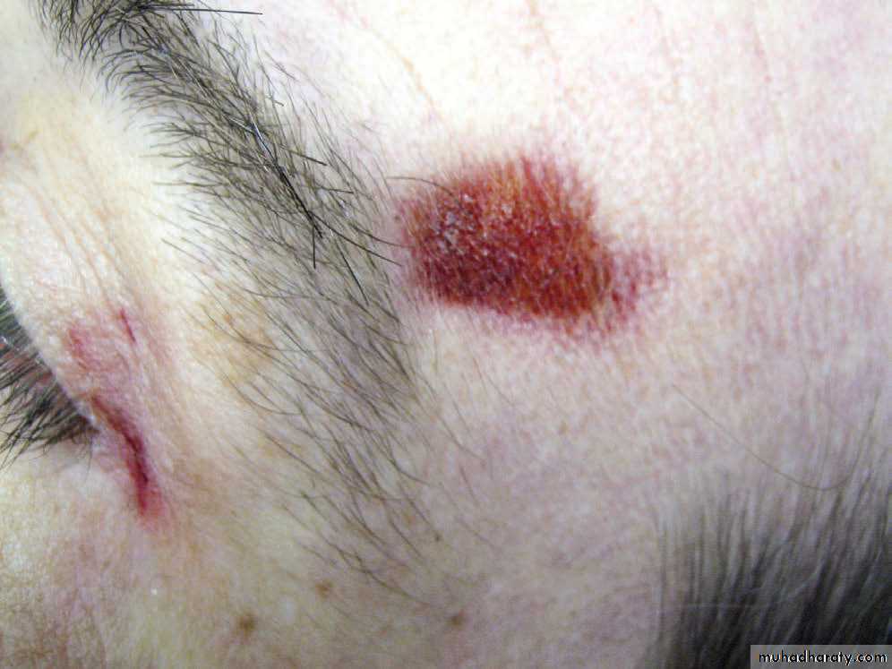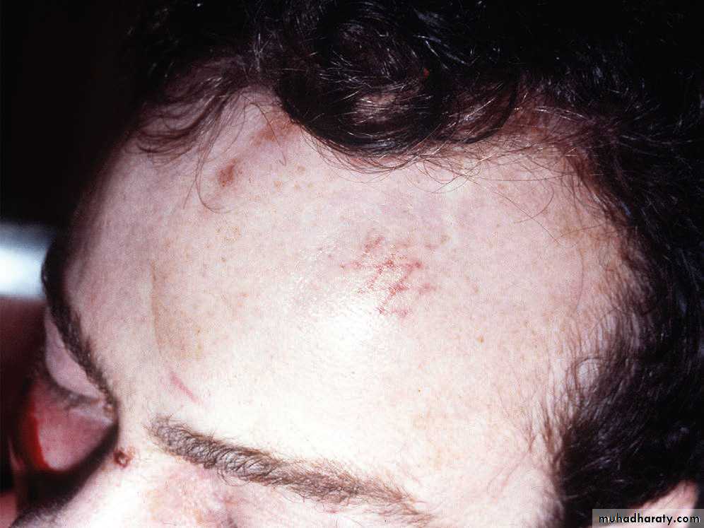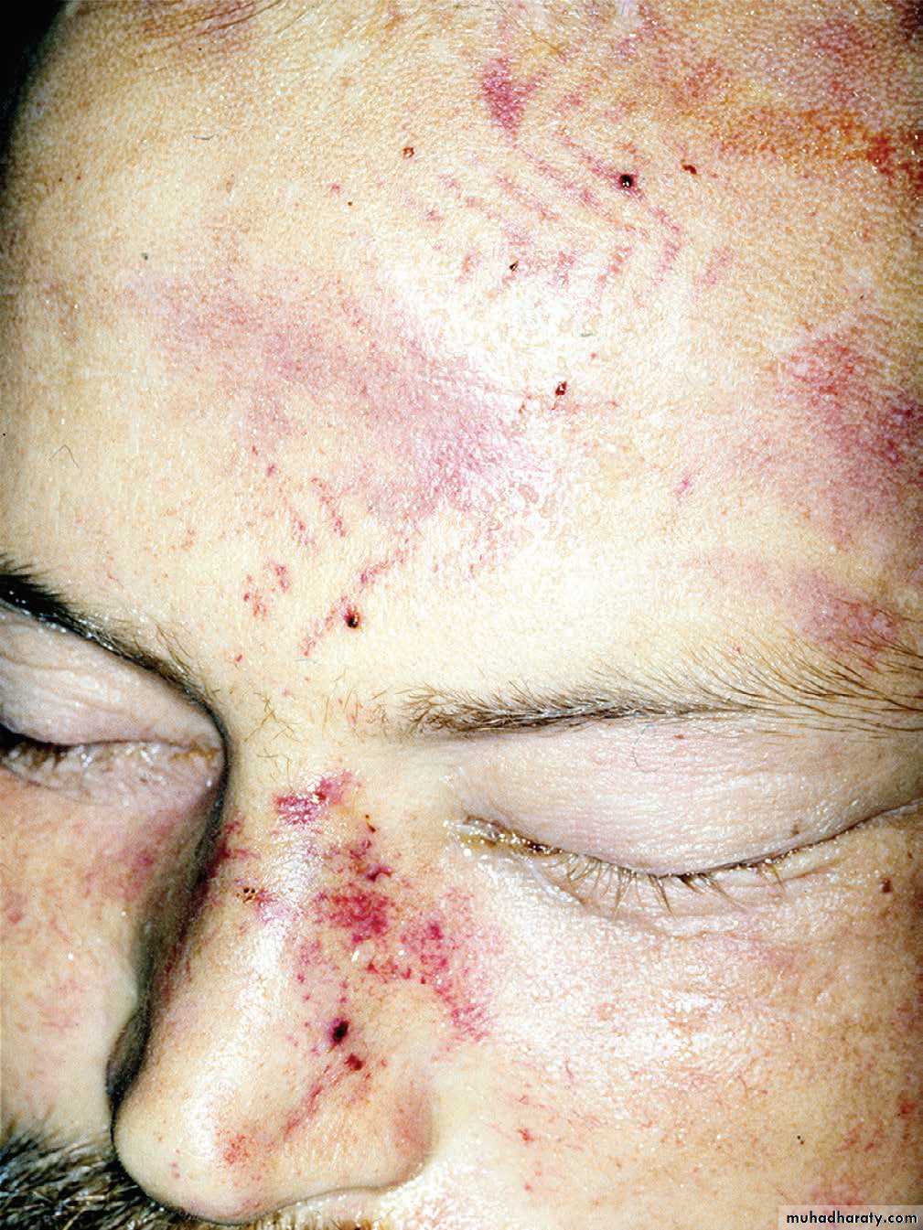 Patterned abrasion on forehead due to falling down steps onto a metal grid. Here the abrasions are not produced by tangential force, but imprinted directly by impact at a right angle to the skin