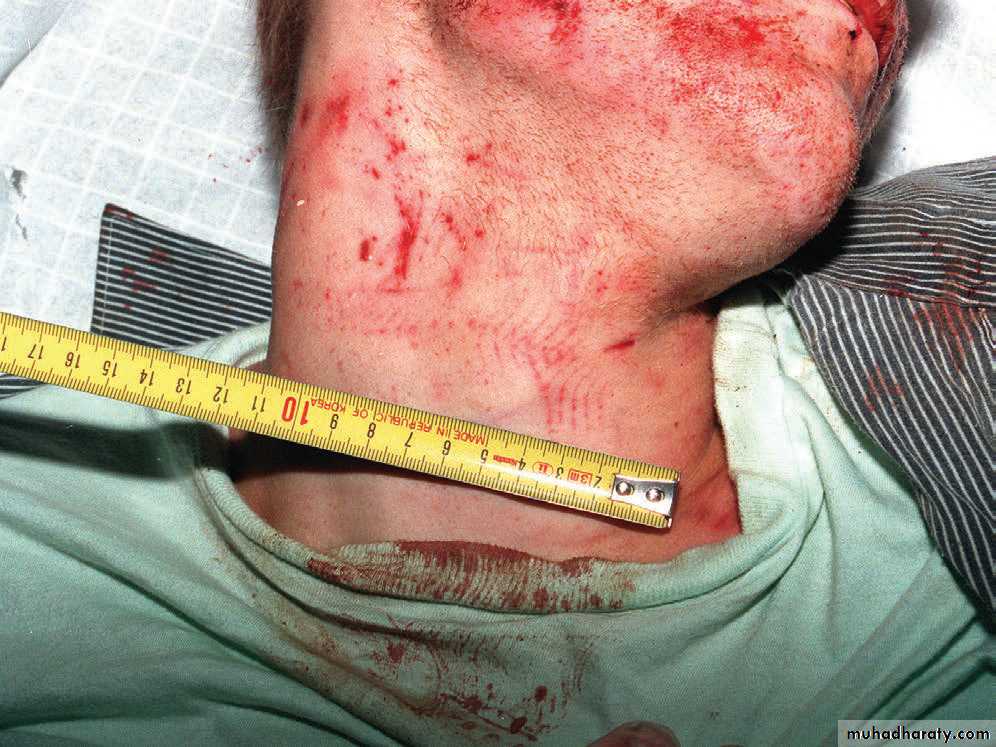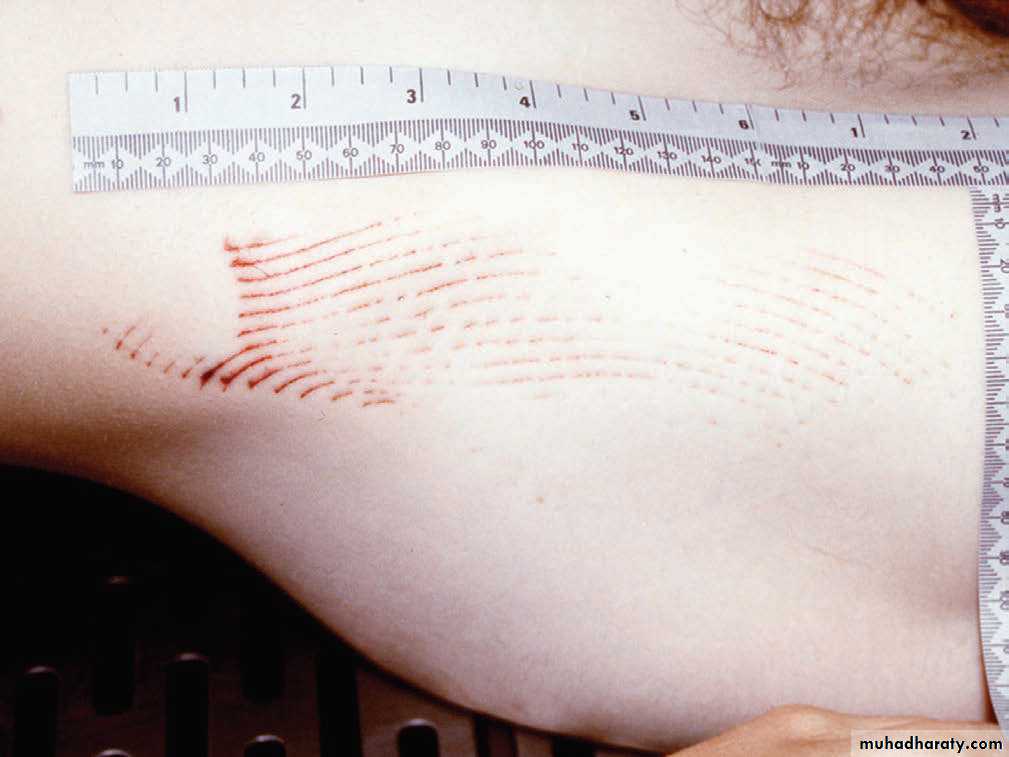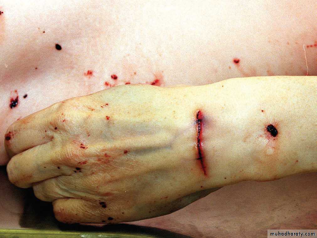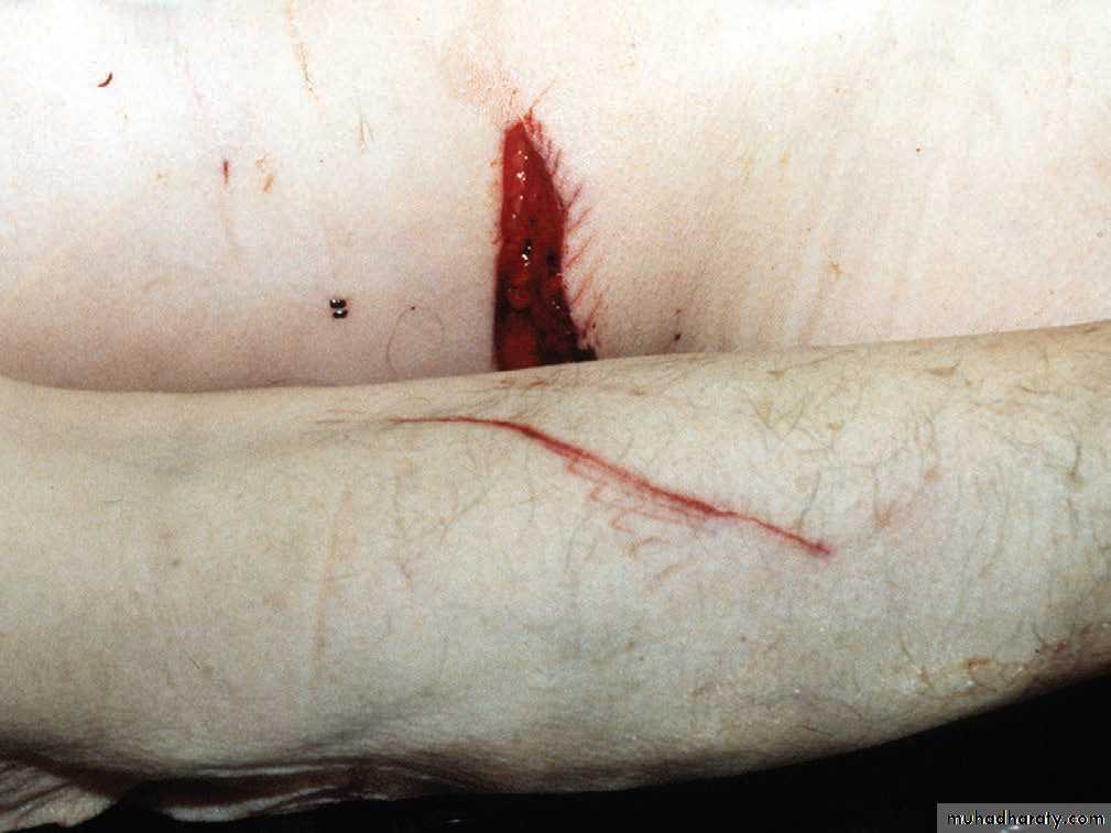 Homicidal slashed wounds caused by knife; the length is greater than the depth, unlike stab wounds. The long tails are due to the knife rising from the skin, thus indicating the direction of the slash.