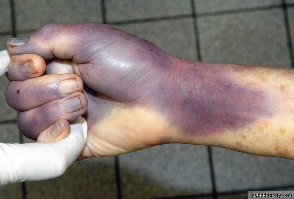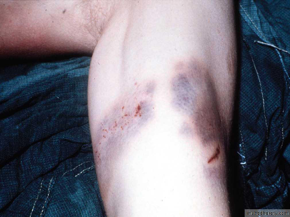 Defense injuries: extensive bruising on the hand in an attempt to fend off kicks. Such injuries confirm that the victim was conscious and active during the attack, and that it was not made covertly while the victim was unaware.