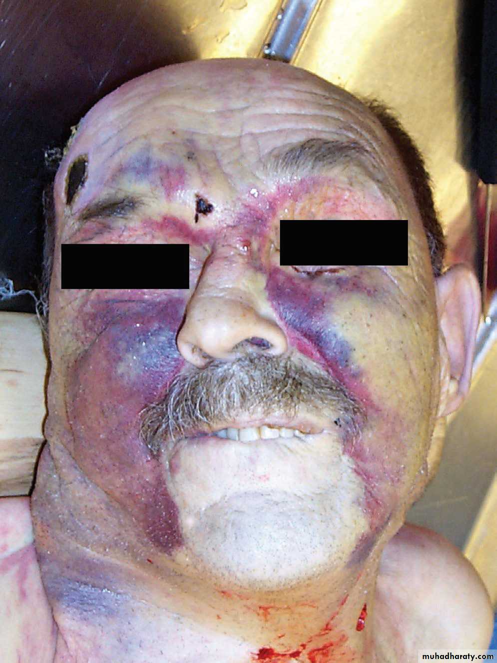 Extensive bruising of the face due to hitting, kicking and stamping 6 days earlier. The victim had multiple fractures of the facial bones, bilateral serial rib fractures and a tension pneumothorax