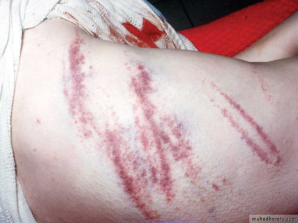 Bruises from a beating with a broom handle They are approximately parallel and several, especially the lowermost, show a double ‘tram-line’ appearance typical of the impact of a round or square-section rod. The pressure in the center compresses the vessels so that they do not bleed.