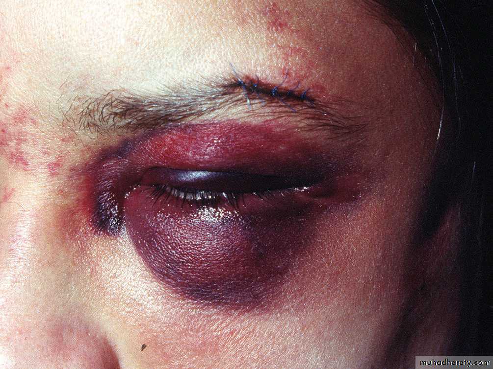 A black eye (periorbital hematoma) of a live victim from a direct fist blow, which has also bruised the bridge of the nose and lacerated the corner of the eye (sutured).
