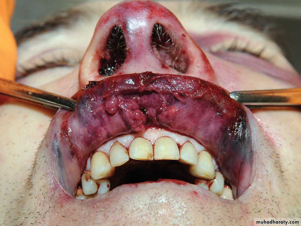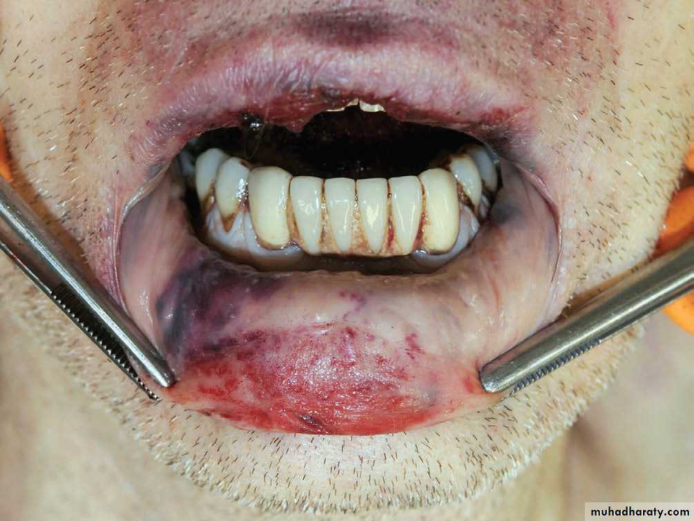 Bruising of the interior of the lip from a blow to the mouth. The lip has been impacted on the underlying teeth, but not sufficiently hard to cause a laceration