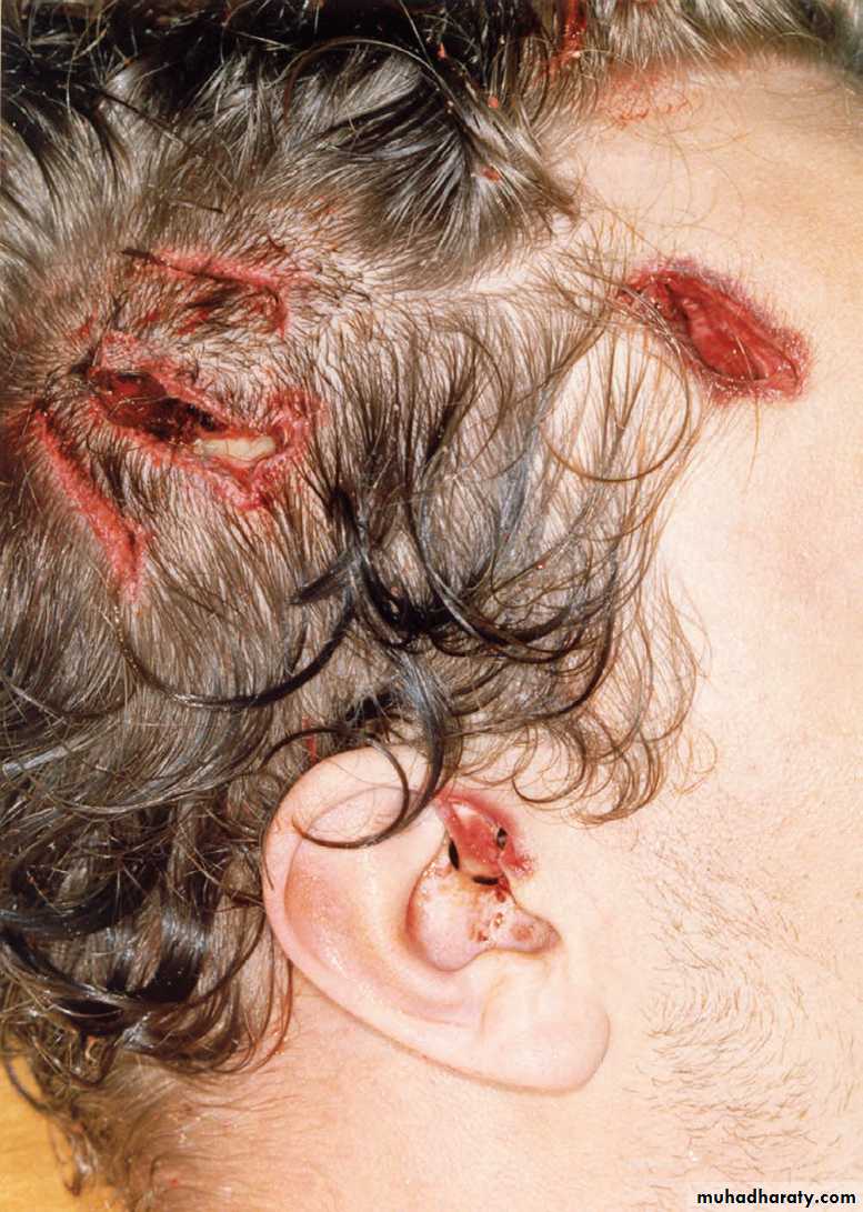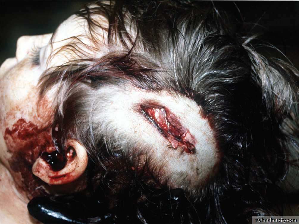 Homicidal lacerations of the scalp penetrating the skull. Although some of the injuries resemble incised wounds, their margins are crushed, and hairs and tissue strands cross the injuries. The damage was probably inflicted with a metal rod with sharp edges.