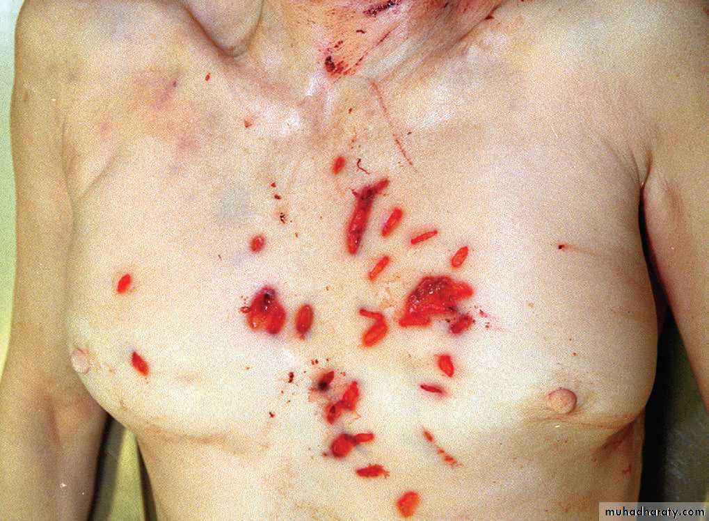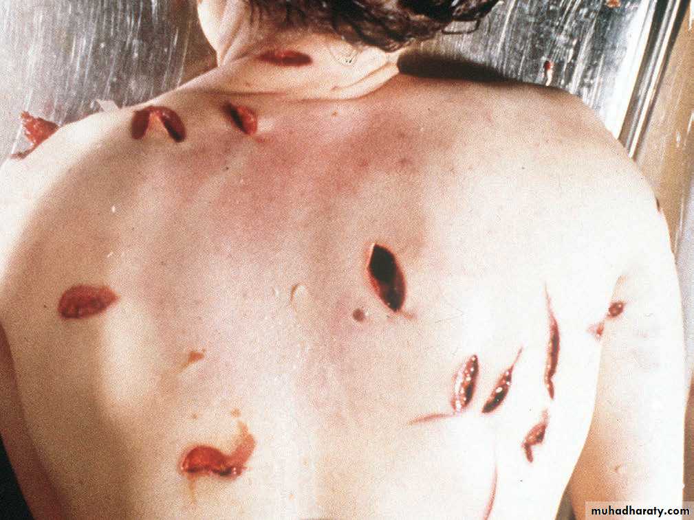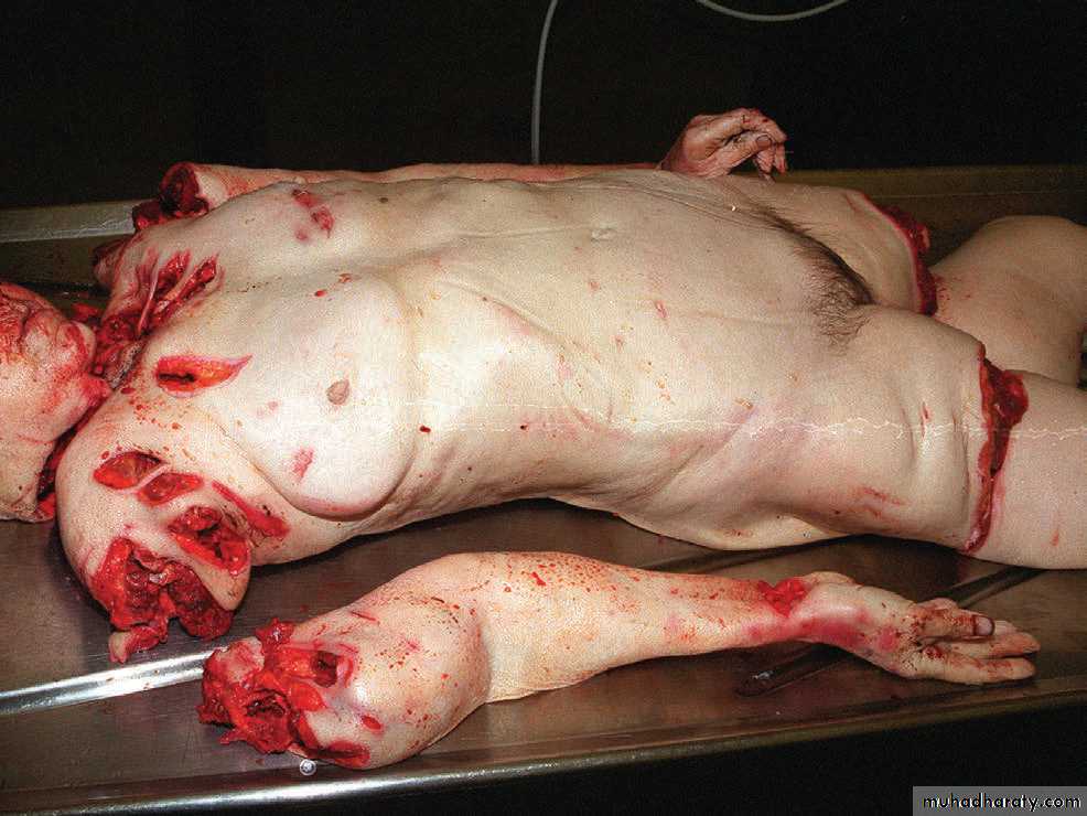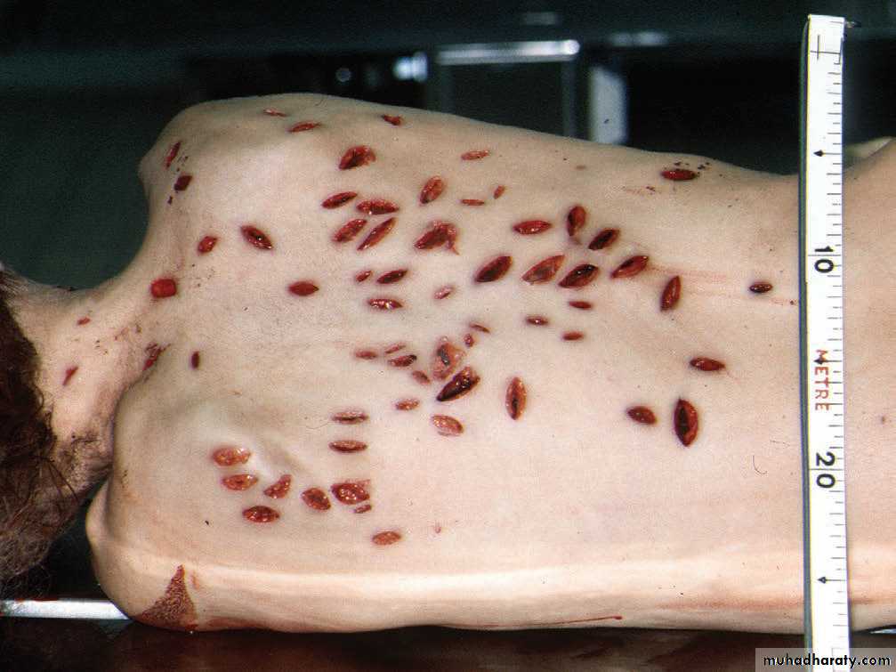 Multiple homicidal knife wounds, all inflicted with the same weapon. This shows the marked variation in wound size from the same knife, caused by rocking and twisting movements of either weapon orvictim.