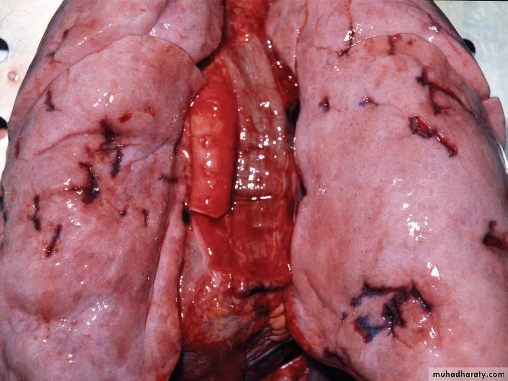 Multiple stabs in the lungs from the same knife with fresh wound haemorrhage and varying wound size according to the angle and depth of the stabs. The lungs appear anaemic due to the massive loss of blood.