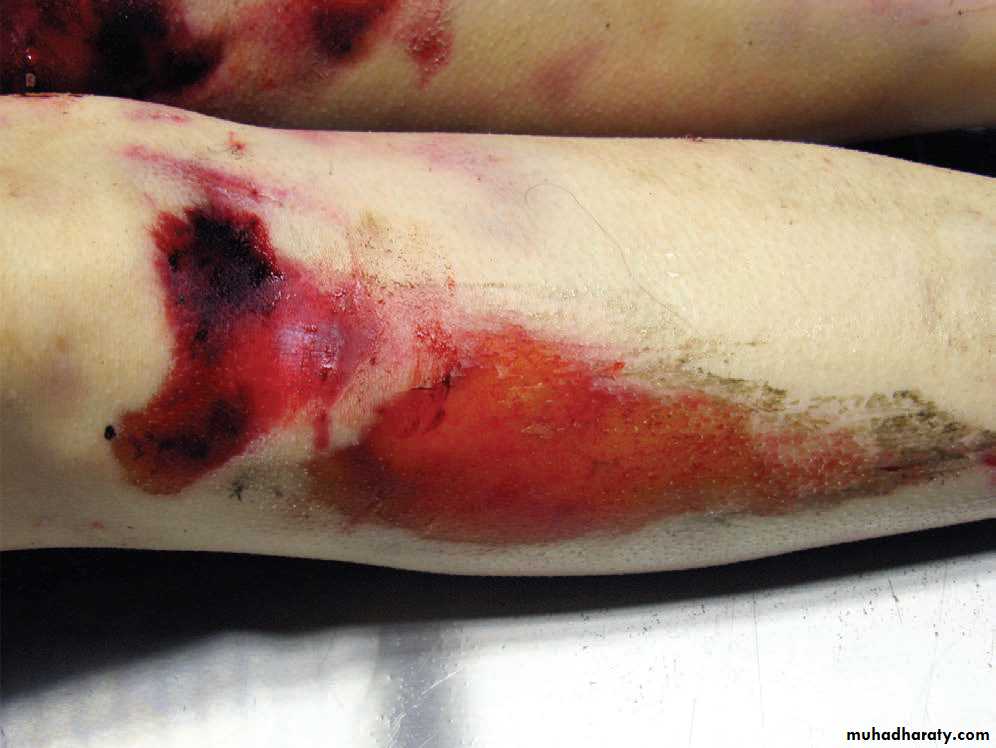 Brush abrasion from skidding contact with the road surface. The lesion is partly abraded and partly bruised. The direction of movement can be discerned, as the bruises begin more abruptly below the kneecap, and tail off superficially towards the ankle.