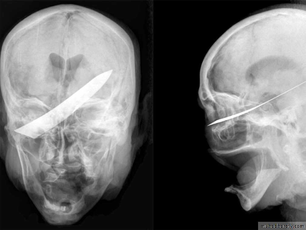 X-ray of the skull of the victim in previous case , showingthe position of the knife blade.