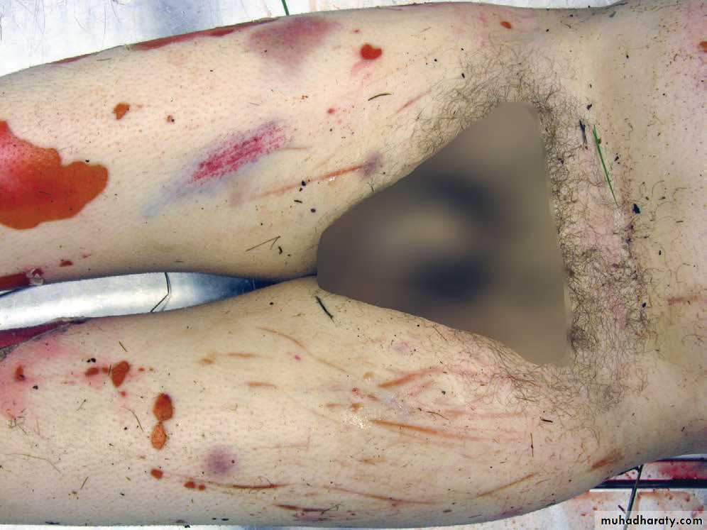 Drag marks on the front of the thighs of a murder victim. In addition to the drag marks there are bruises, and burn injuries above the knees on both sides. Death was caused by stab wounds to the chest.