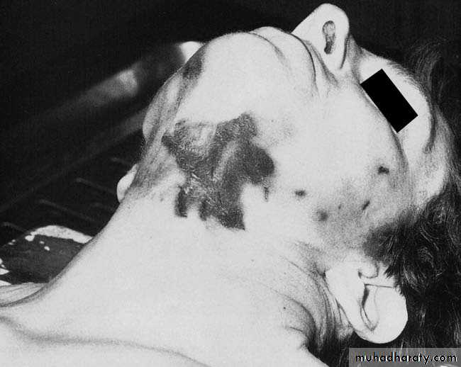 Abrasions in manual strangulation. The area is more extensive than is usually seen in such circumstances. The large area of superficial damage to the epidermis is caused by sliding movements of the assailant’s hands, the area having become dried and leathery during the postmortem interval. The smaller marks are fingernail scratches