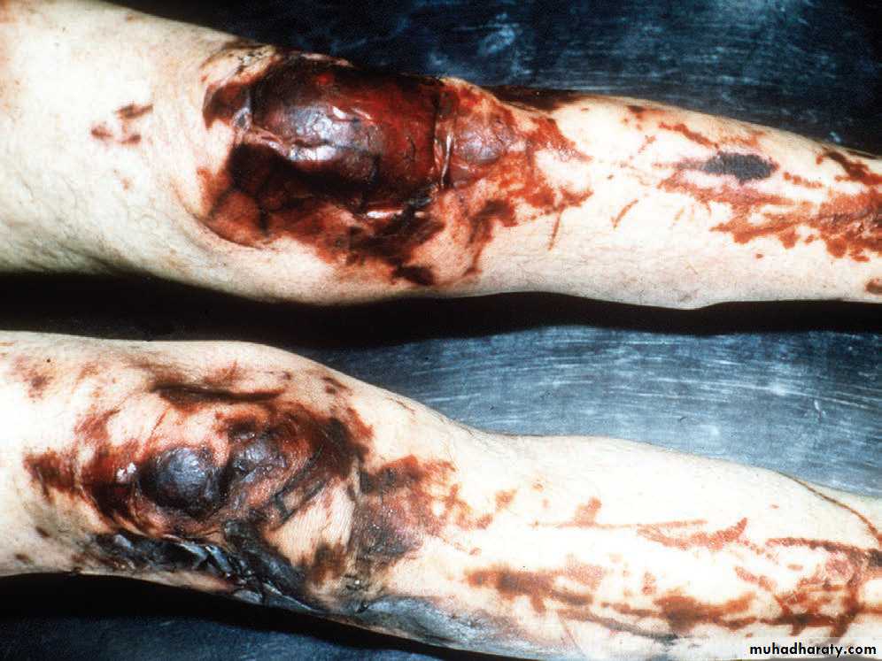 Extensive abrasion of the knees and shins, in a drunk who stumbled amongst furniture before dying of a head injury. The damaged skin has exuded tissue fluid, which has dried post-mortem to produce the dark, leathery appearance