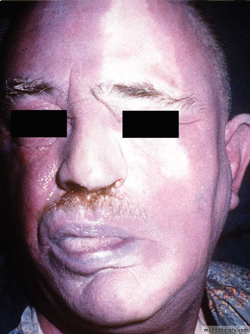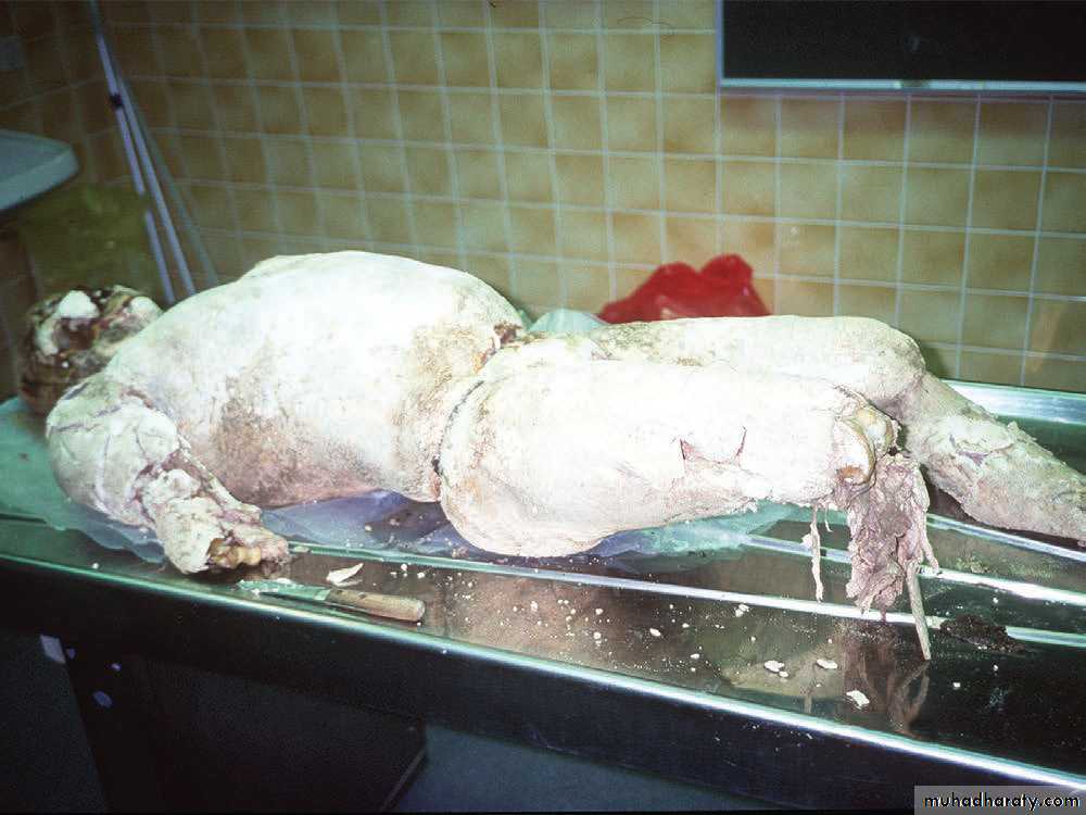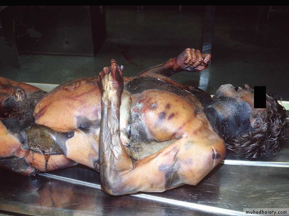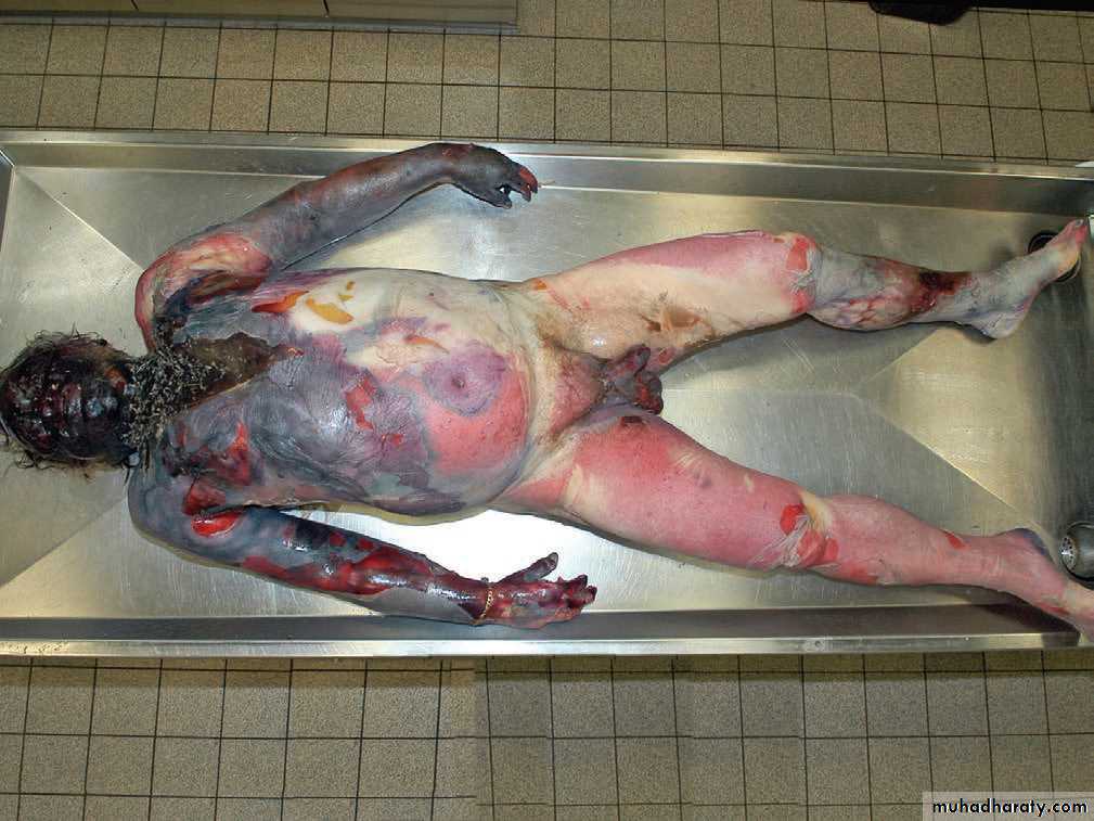 Post-mortem decomposition showing varying degrees of putrefactive changes in the face, trunk and extremities. The illustration shows the contrast sometimes seen between one part of the body and another, as the right leg and lower left side of the trunk are only slightly affected. The face, neck and hands are swollen with gas.