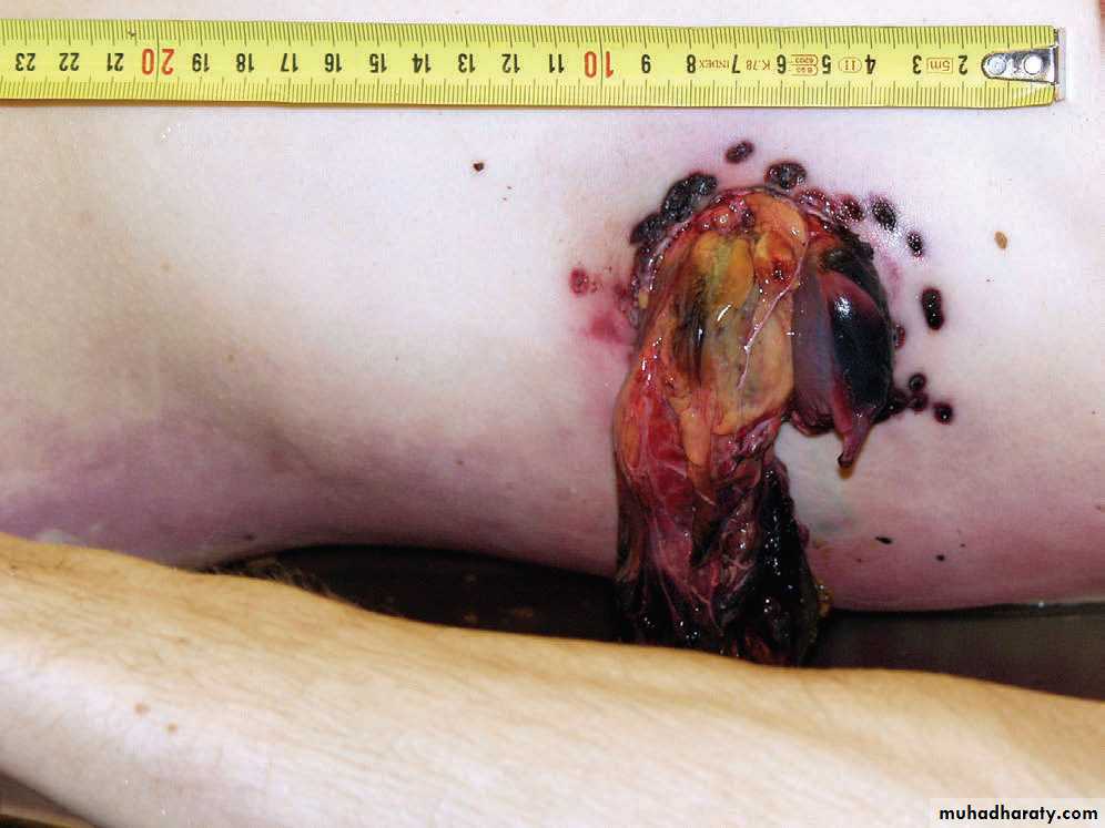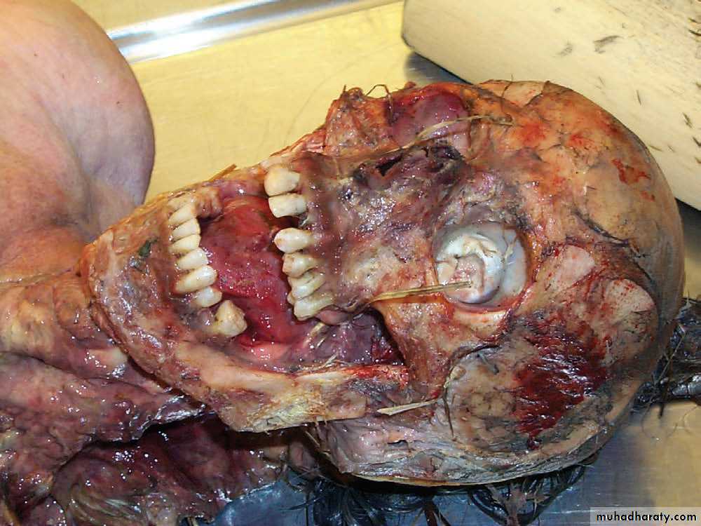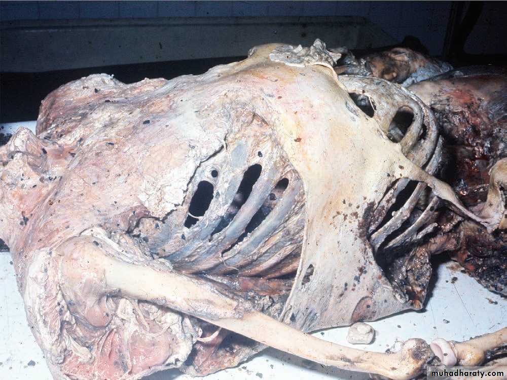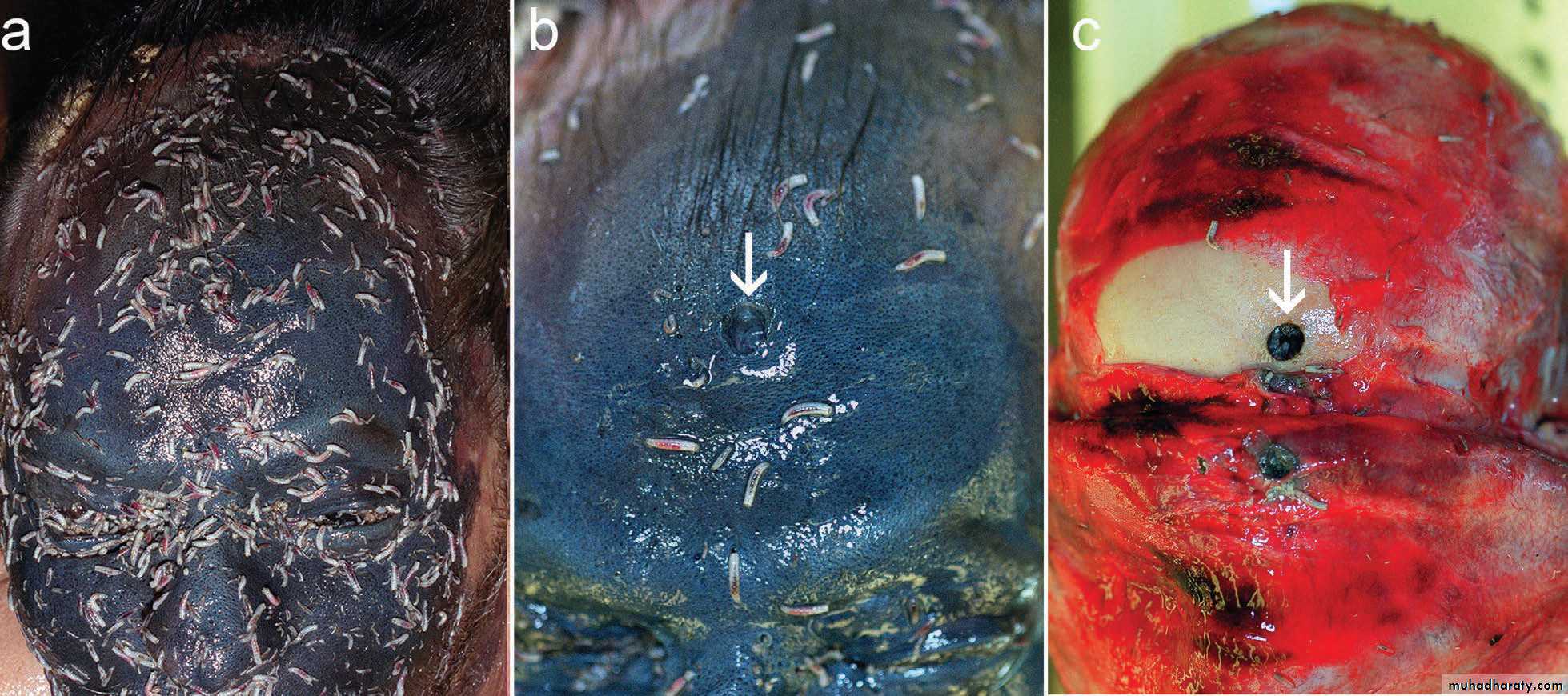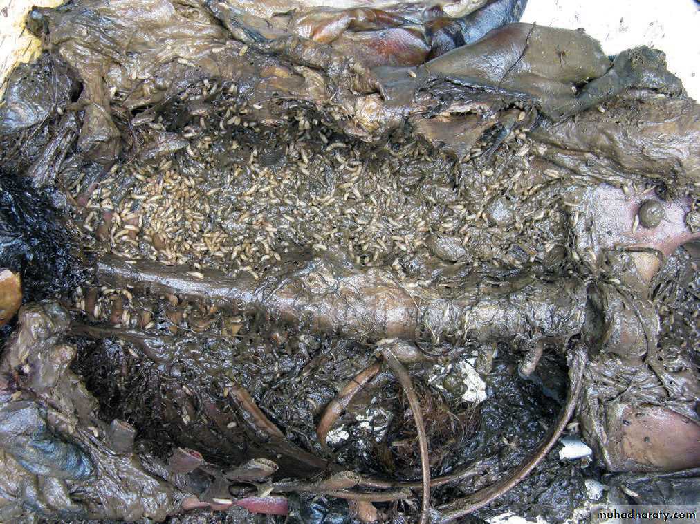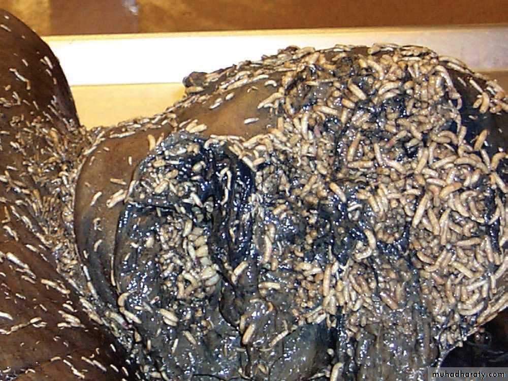 Maggot-infested body cavity with completedestruction of the internal organs.