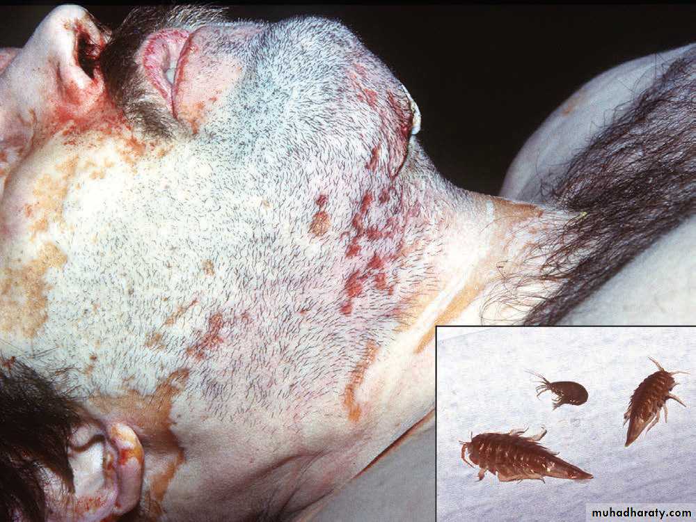 A body recovered from the Baltic Sea with numerous superficial skin defects on the face and neck due to post-mortem predation, probably by the crustacean Saduria entomon, shown in the inserted picture with a smaller shrimp in the middle.