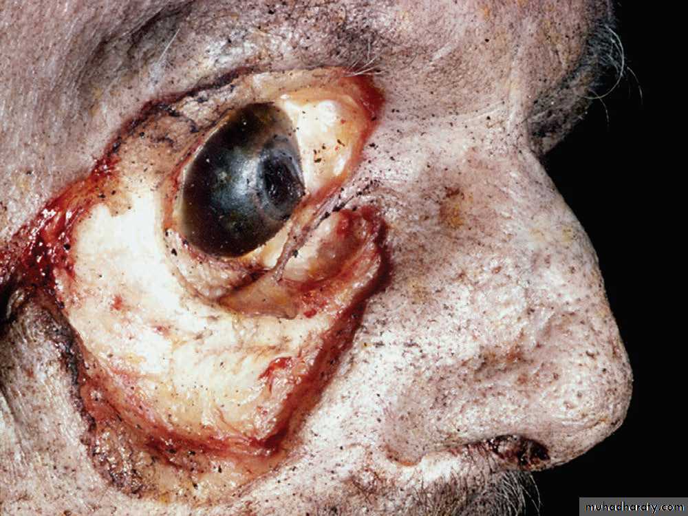 Post-mortem rat bite of the orbit. Such injuries are – not unnaturally – often regarded with suspicion by the police. The complete absence of bleeding or reddening of the wound margins, as well as the unlikely shape and situation of the injury, make its post-mortem origin obvious.