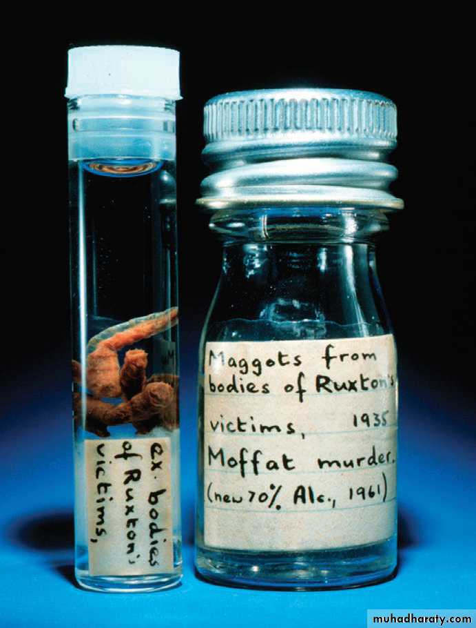the remains of two human bodies infested by blowfly larvae, and identified as belonging to the wife and the maid of Dr. Buck Ruxton, were found in Dumfriesshire, Scotland. This case was the first in which insect evidence succesfully contributed to a murder investigation in the UK. The vial and the tube contain some of the blowfly larvae collected from the remains of thevictims of Dr. Ruxton. (Reproduced by kind permission of the Natural History Museumc, London [Martin Hall].)