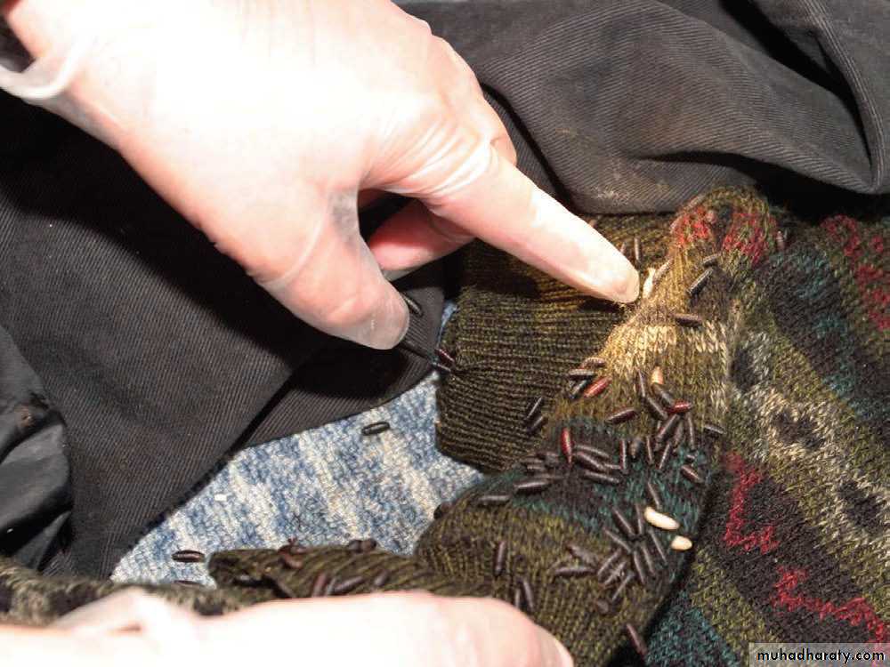 Maggots of the third instar that have left the body to pupate. Dark brown and paler (younger) blowfly pupae (Protophormia terranovae).