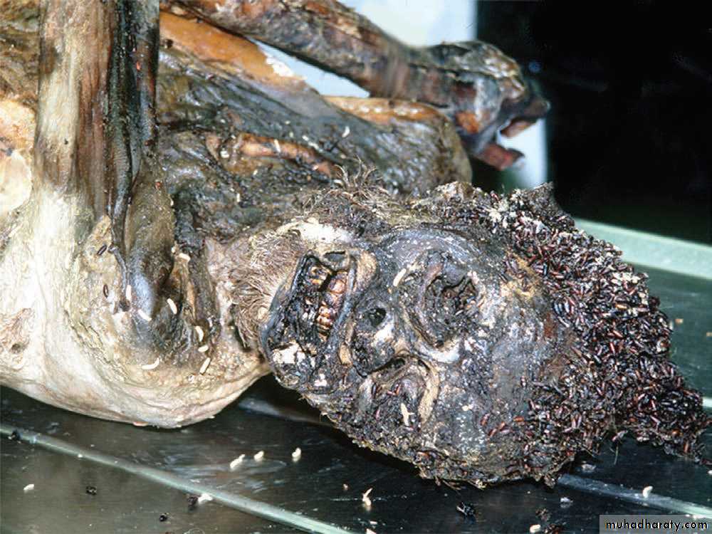 Mummified body of an elderly male that had been lying dead in a block of flats for about 2 months in temperate climate in summer time. There are a few maggots of different stage and the head is covered with a thick layer of pupae.