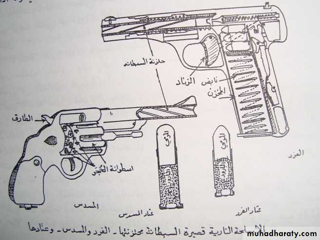 عتاد السلاح الناري : ـ على الرغم من اختلاف العتاد من سلاح إلى أخر إلا أن مكوناته الأساسية واحدة في اجمعها فهو يتكون من الأجزاء التالية:1ـ المقذوف. 2ـ البارود. 3ـ الظرف ( الخرطوشة ). 4ـ الكبسولة