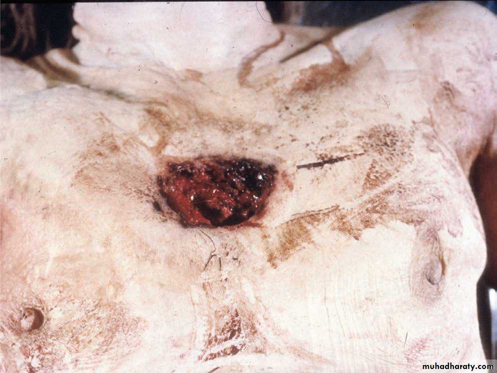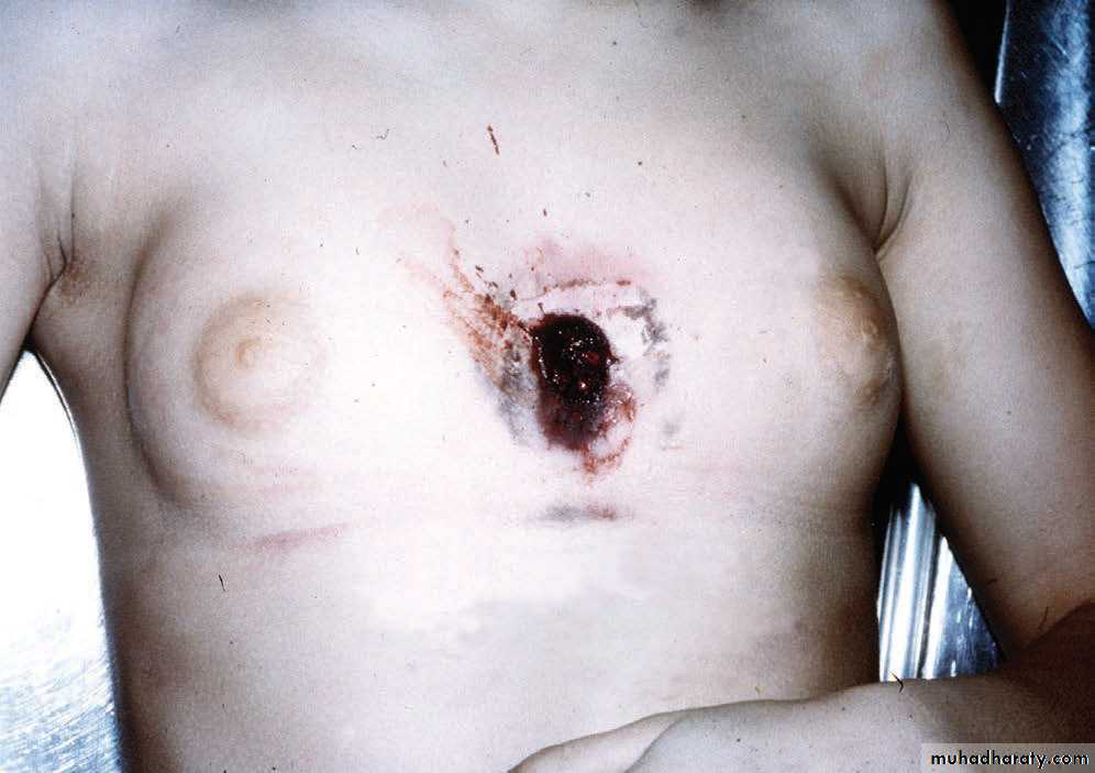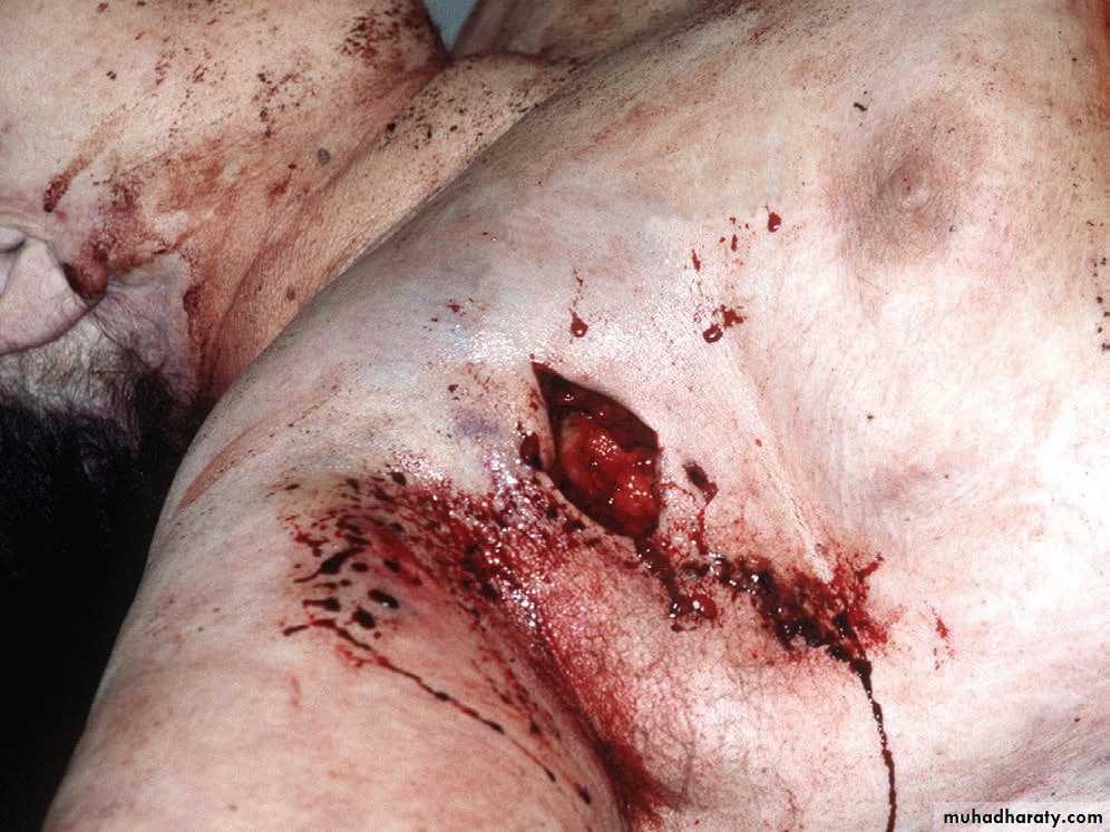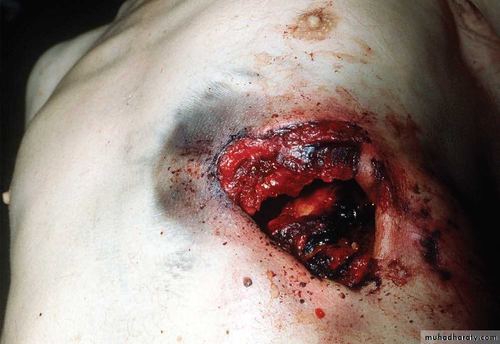 Suicidal twelve-bore shotgun wound. Not all such wounds are circular – this one has torn a large defect in the chest wall because the shot struck at an acute angle. The smoke smudging is extensive, showing an asymmetrical soot pattern. The precordium is another site of election for suicidal shooting.