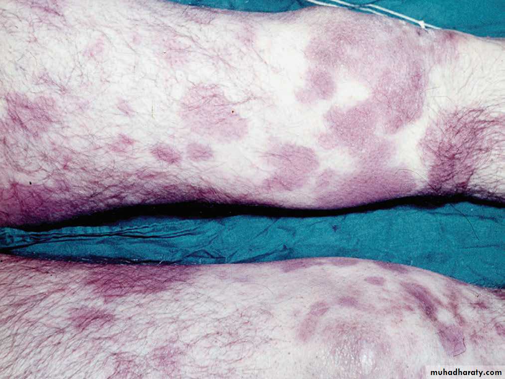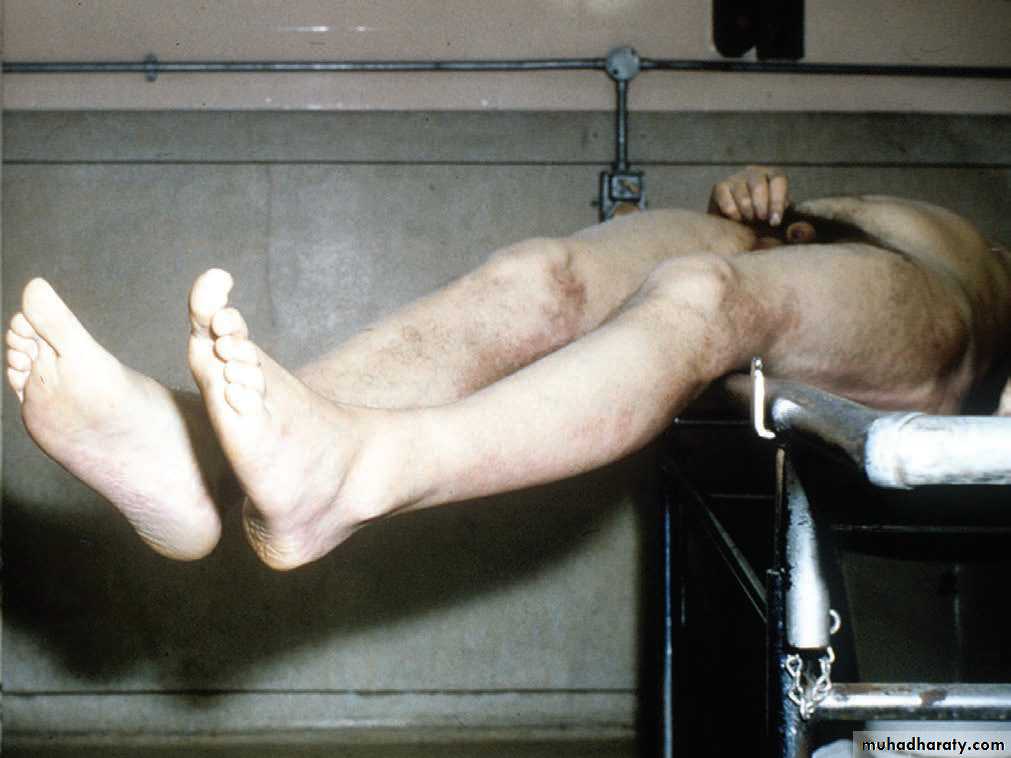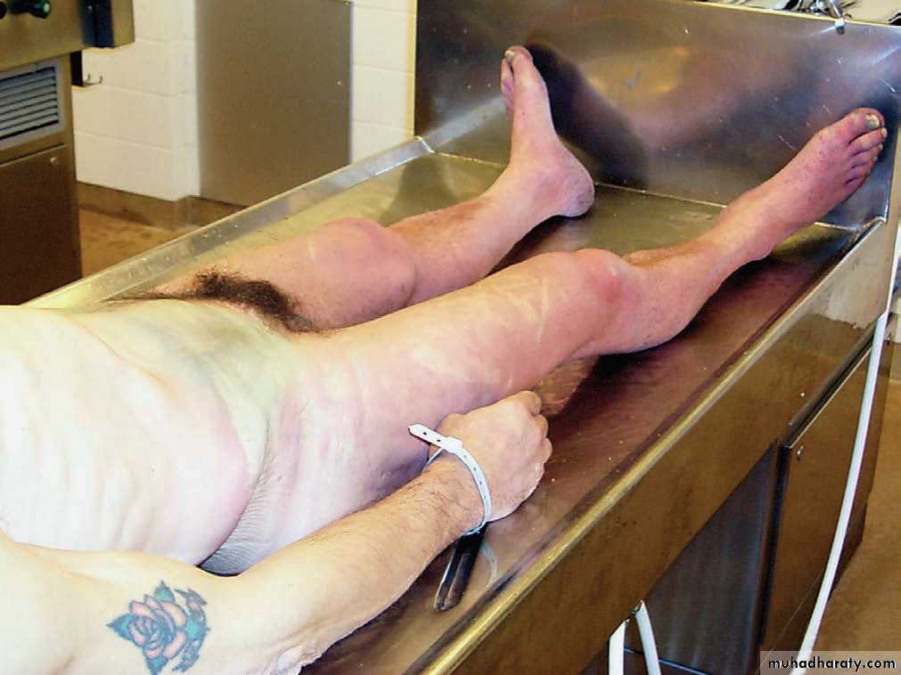 Post-mortem hypostasis in a death from hanging. The discolouration of the skin is in the legs and hands, due to the vertical posture after death.