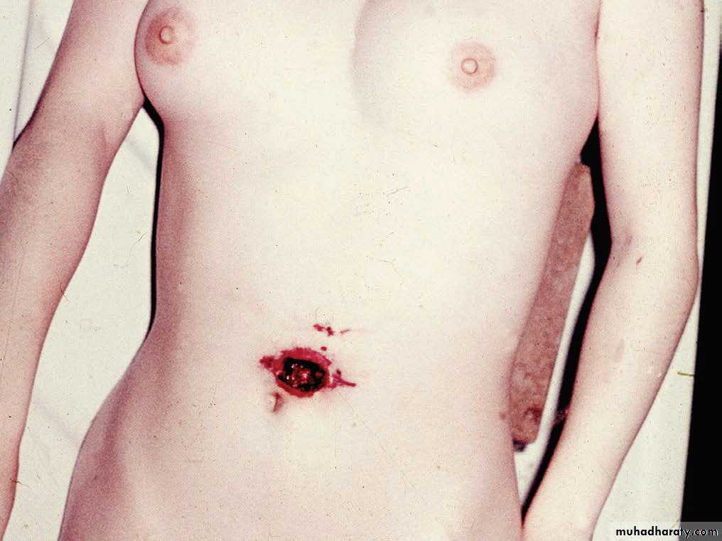Firm contact wound from a twelve-bore shotgun. The clothing has prevented any soot soiling, but there are minor peripheral abrasions from impact of a belt. As the abdomen was distensible, the gas expansion has not caused splitting of the skin at the wound edges.