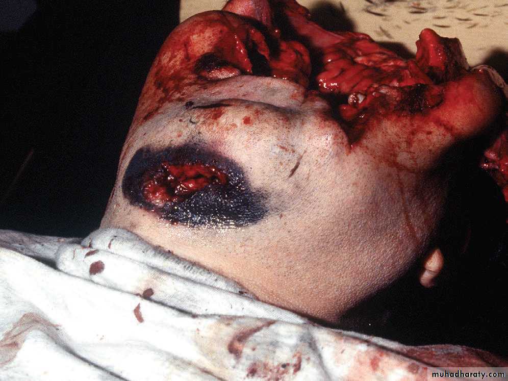 Suicidal twelve-bore shotgun wound. Theentrance is in one of the ‘sites of election’, in the neck, andthe circular smoke fouling indicated a close or even contactdischarge.