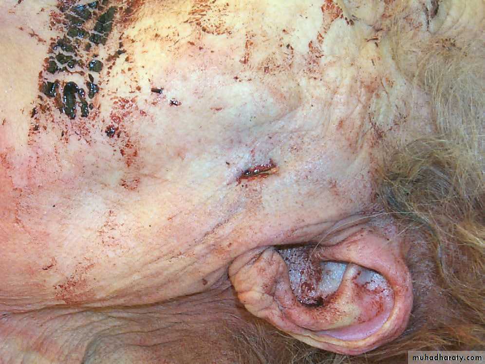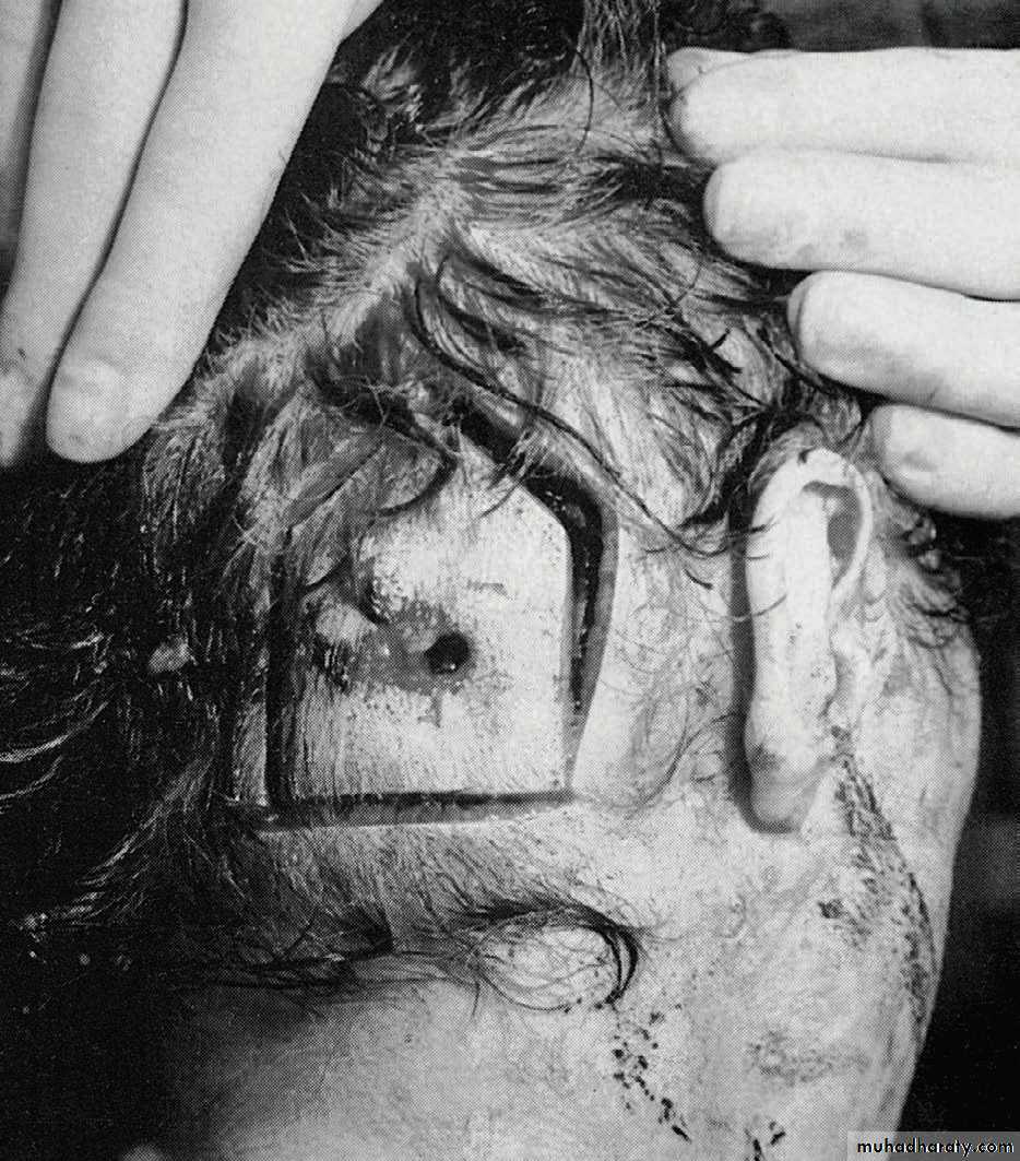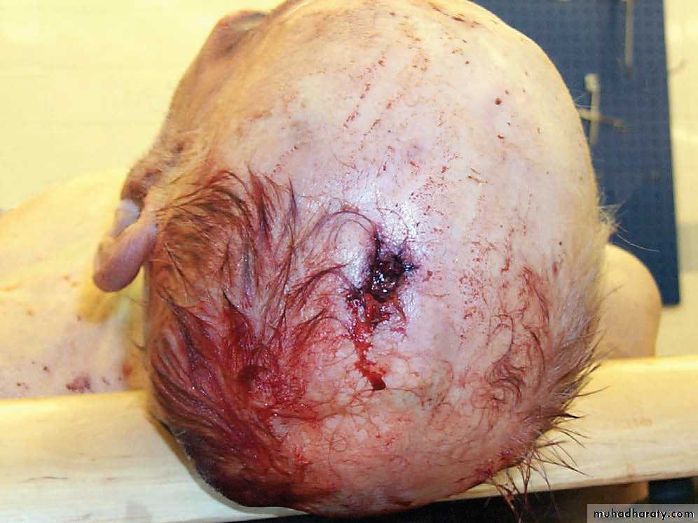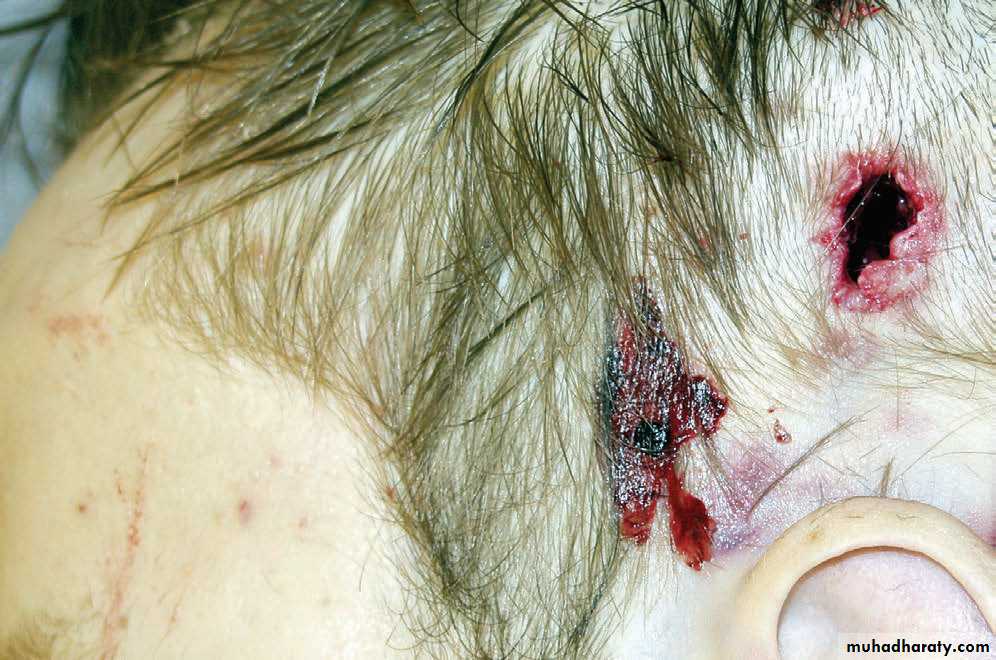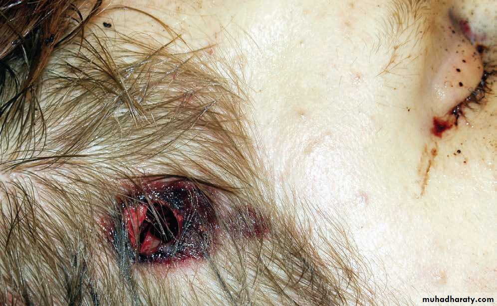 Typical exit wound from a 9 mm bullet. Thewound in the scalp is everted, stellate and quite clean, themissile having been wiped by its passage through the tissues