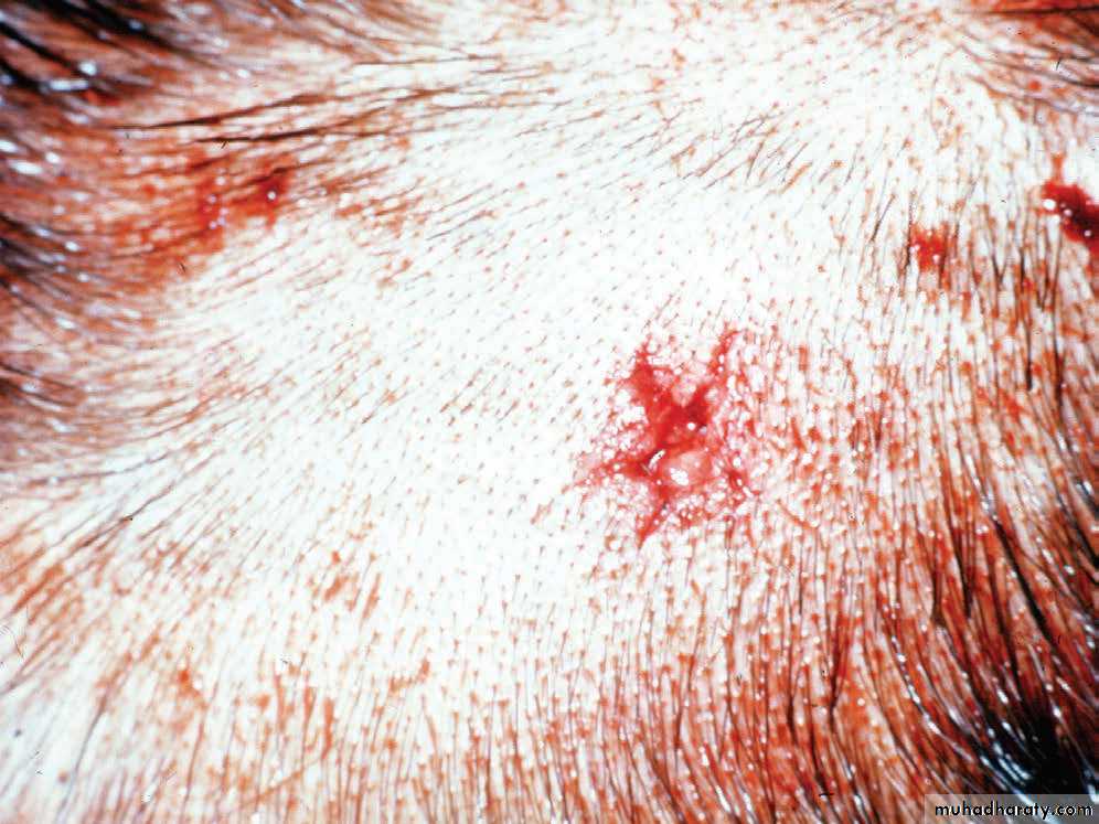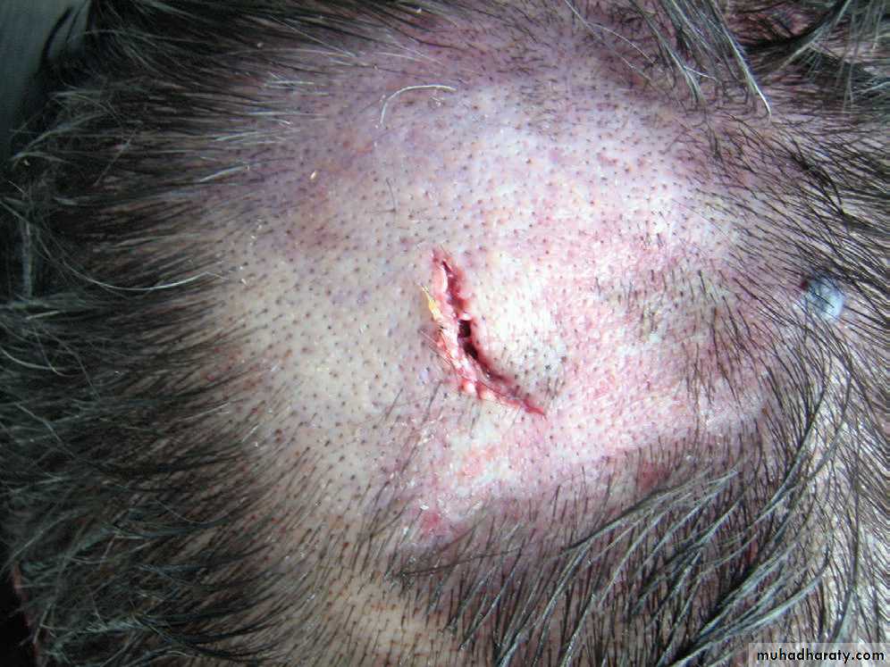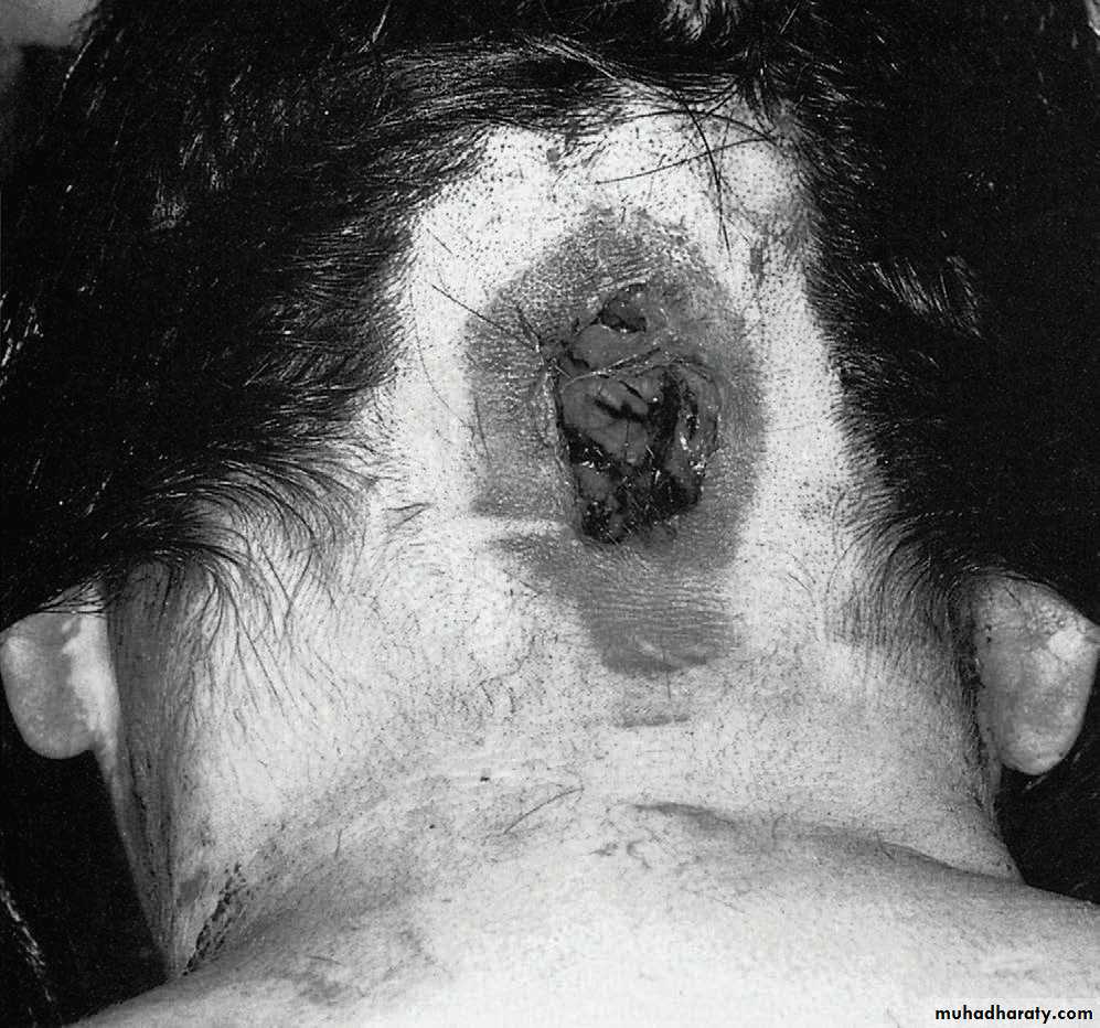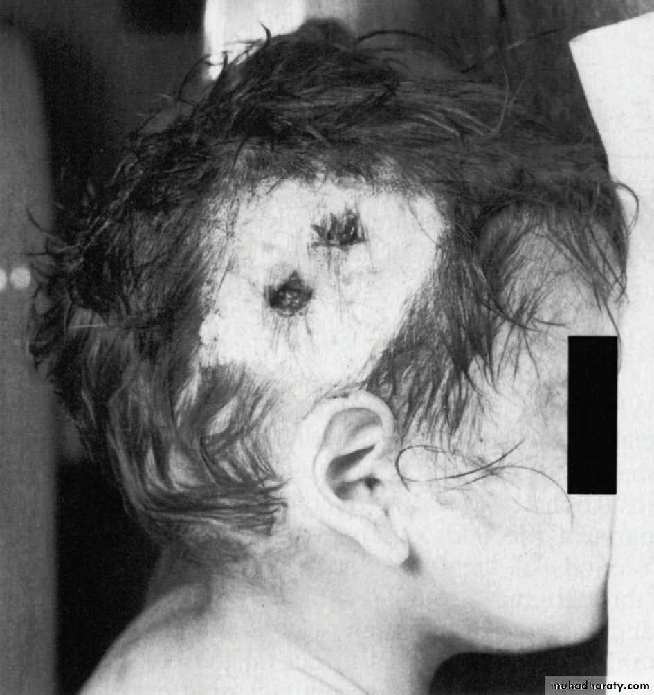 Typical exit wound from a 9 mm bullet. Thewound in the scalp is everted, stellate and quite clean, themissile having been wiped by its passage through the tissues