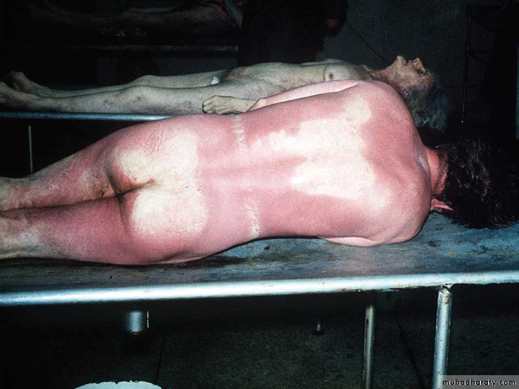 Post-mortem hypostasis in the normal distribution. The pale areas are the result of pressure against a hard supporting surface.