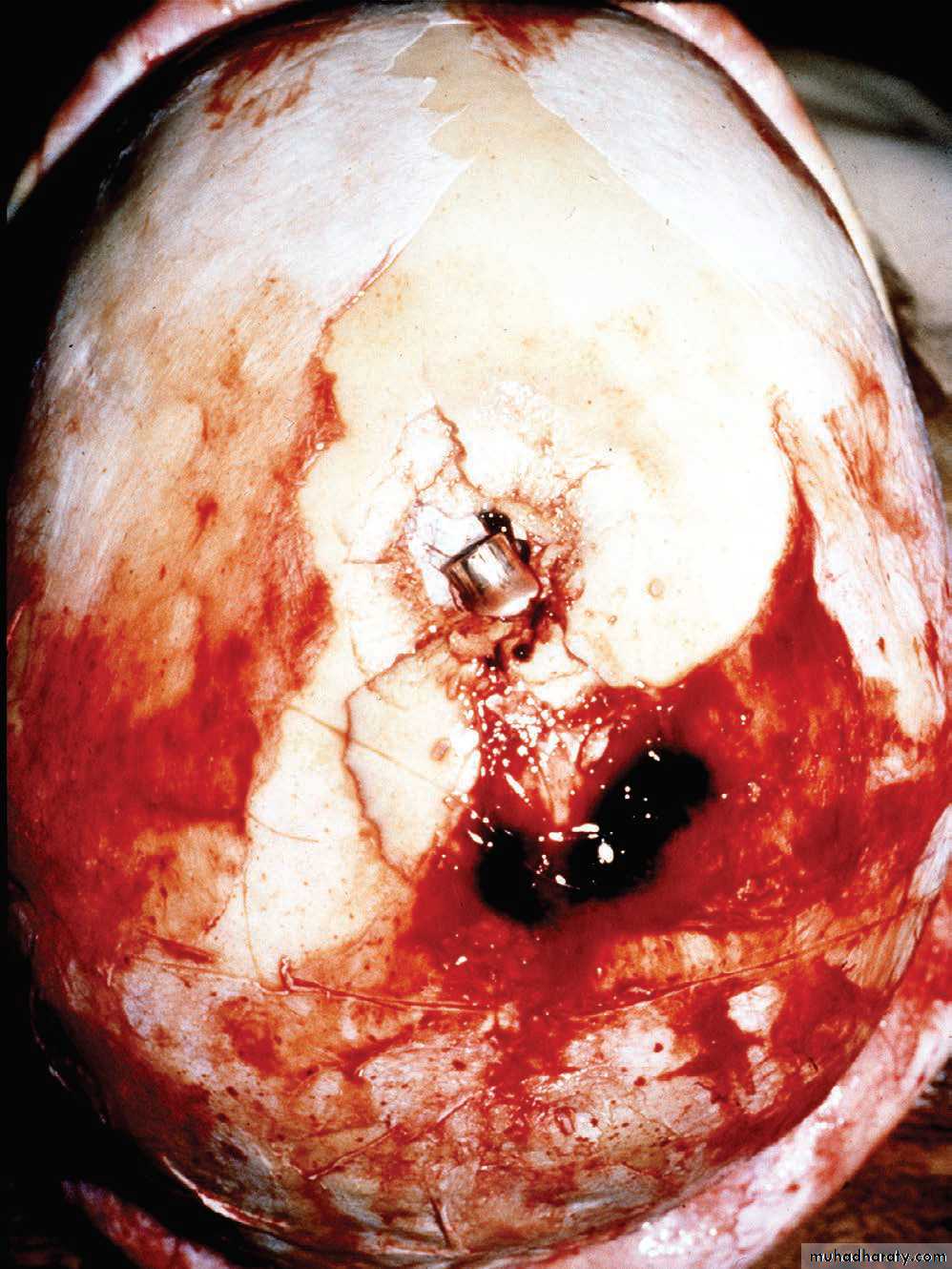 Cone-shaped exit wound of the calvarium, withradial fractures in left parietal bone.