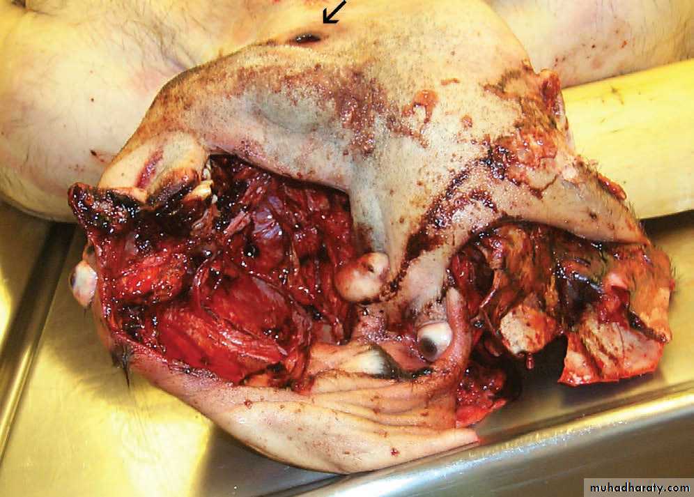 Suicidal contact wound in the neck (arrow) froma 7.62 cal. rifle with destruction of the head.