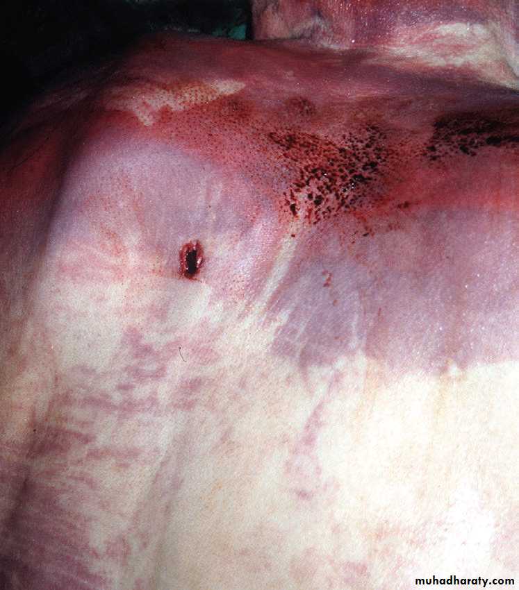 Extensive confluent skin haemorrhages may occur within the dependent hypostasis. They worsen as the post-mortem interval lengthens and must not be taken to indicate so-called ‘asphyxia’.