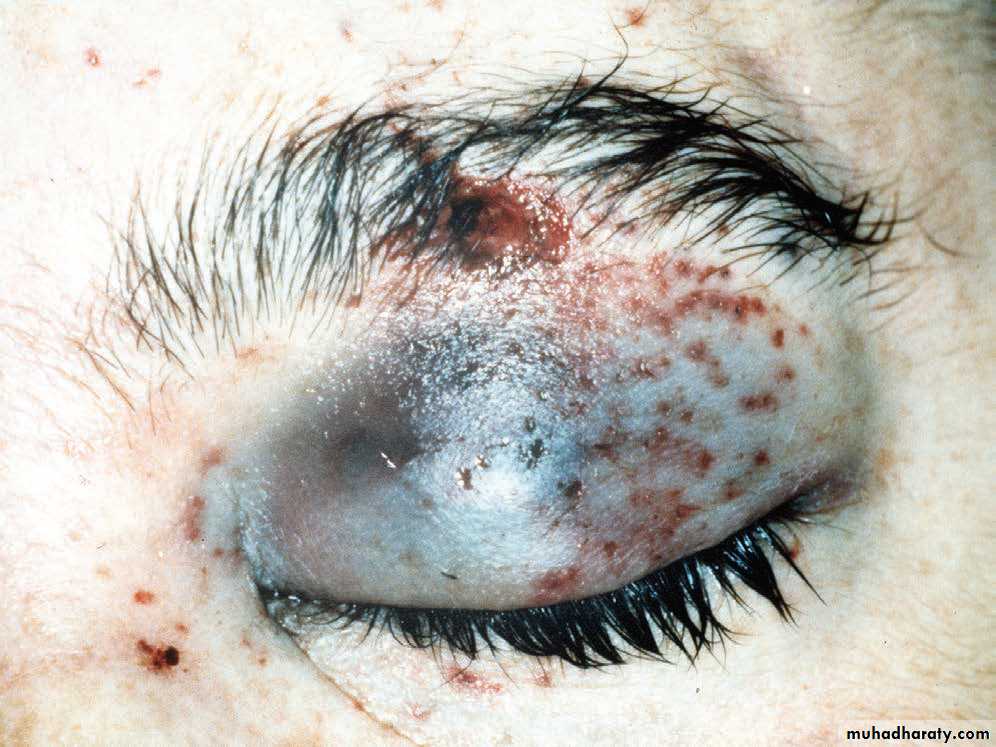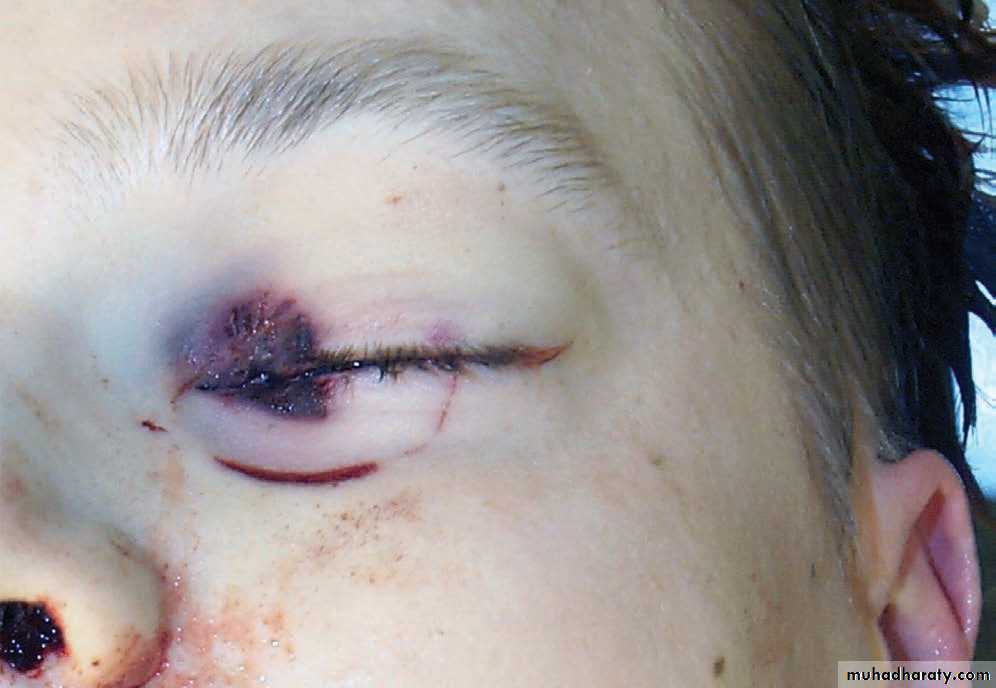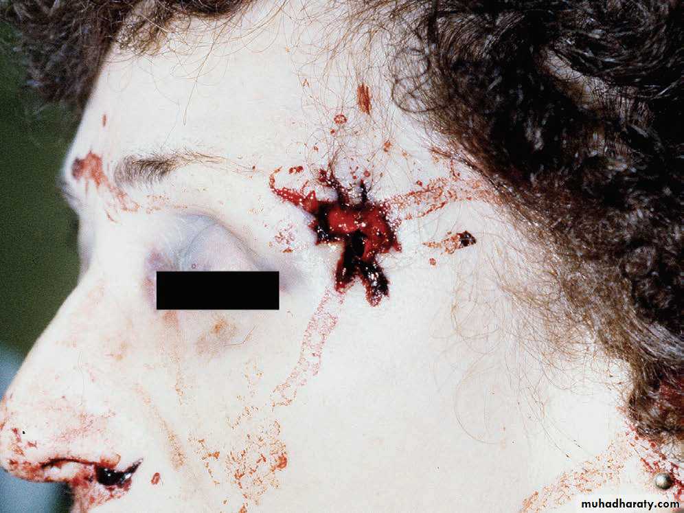 Close-range pistol entrance wound. The eyelid and lower forehead show tiny lesions from propellant flakes. The eyes are blackened by fractures of the floor of the anterior fossa.