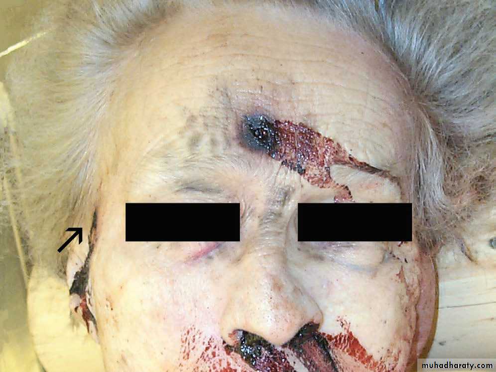 Entrance wounds from a 7.65 cal. auto-loading pistol in the forehead and right side of the face (arrow) of a homicide victim, with soot soiling.