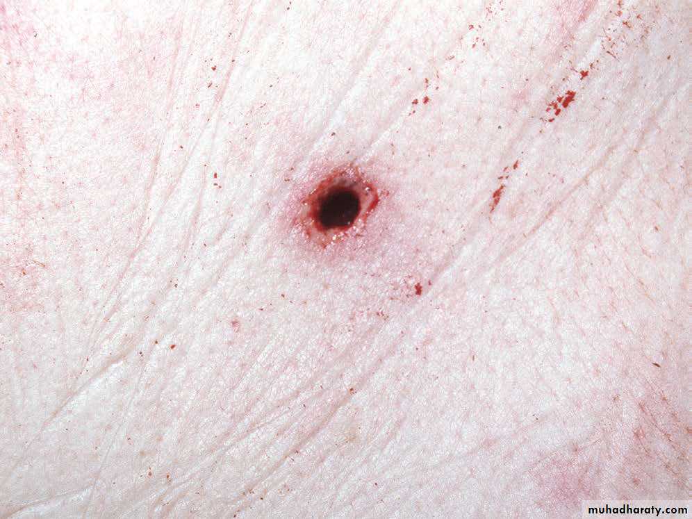 Entrance of a .22 rifle bullet at a range of a few inches. There is slight smoke soiling around the wound, which has a well-marked abrasion collar, which appears black due to additional bullet wipe-off (ring of dirt). In fact, two shots were fired in quick succession through the same hole, which is slightly ovoid because of the non-congruence of the two shots.