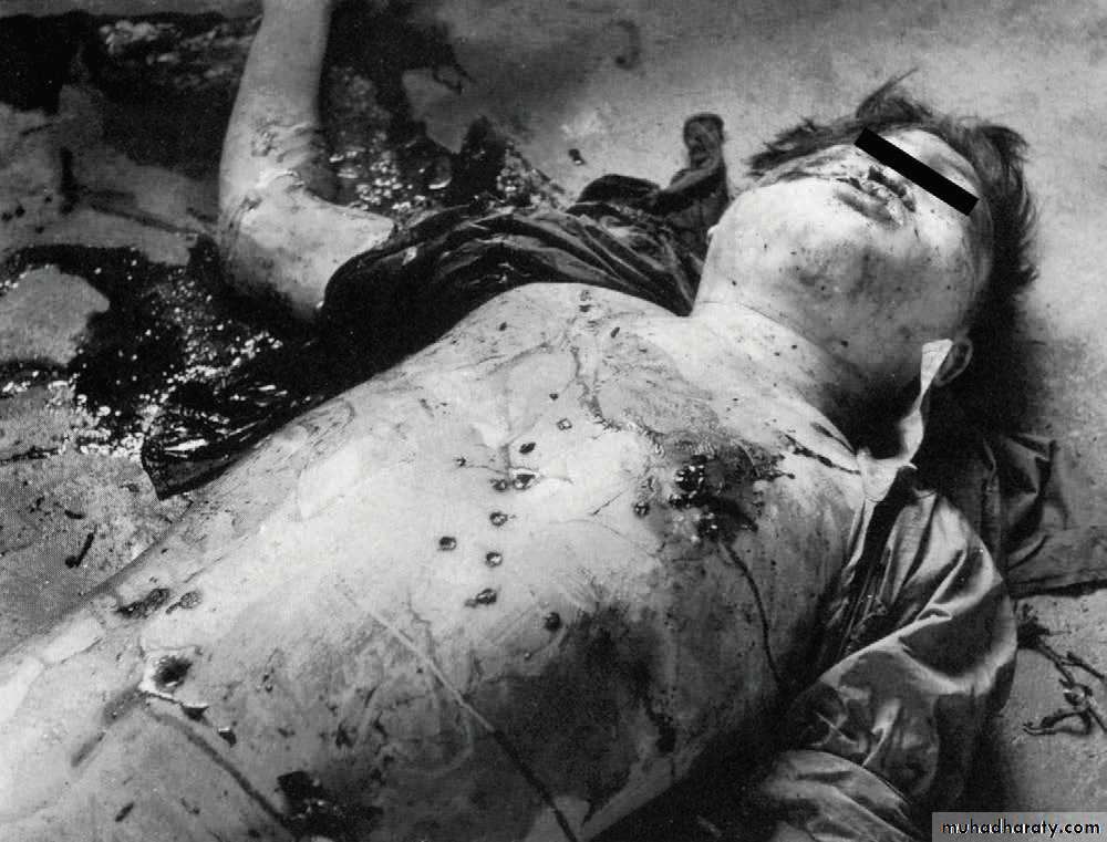 Numerous wounds and peppering by debris projected in a terrorist bomb blast. Blast injuries occur only in close proximity to the device – most injury is caused by flying projectiles.