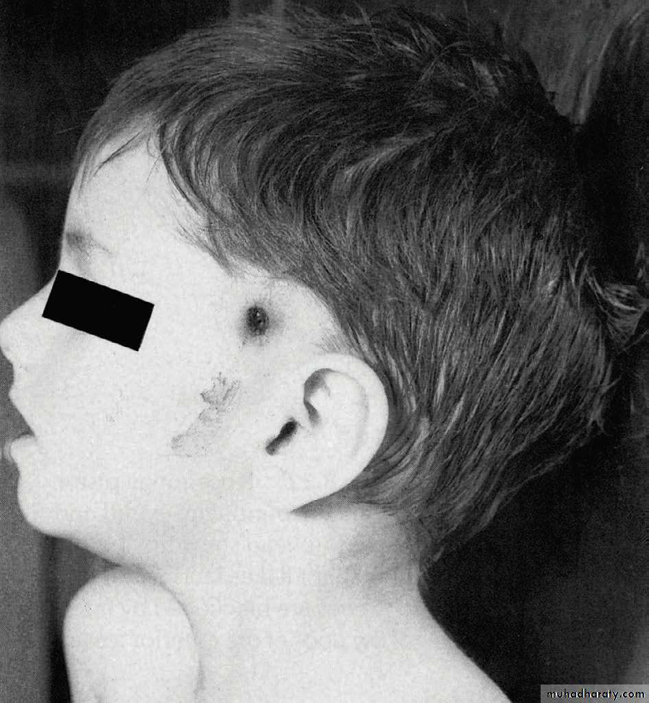 The exit wounds in the fatality shown in Fig.above. The two bullets have diverged inside the head from their common entrance wound and emerged separately. The exit wounds are typically stellate or slit-like and clean. With small-calibre missiles, such as a .22, there is often no exit wound, but here the small head and thin skull provide less resistance to complete traversing