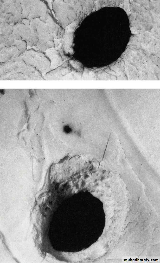 The entrance wound of a bullet into a skull. Externally the defect is clean-cut and slightly ovoid because of the oblique impact of the missile. Internally, the innertable of the cranium is cratered, the bevel being caused by lack of support from the diploe. The exit hole on the opposite side of the skull showed a reversal of this pattern, with the cratering on the exterior surface