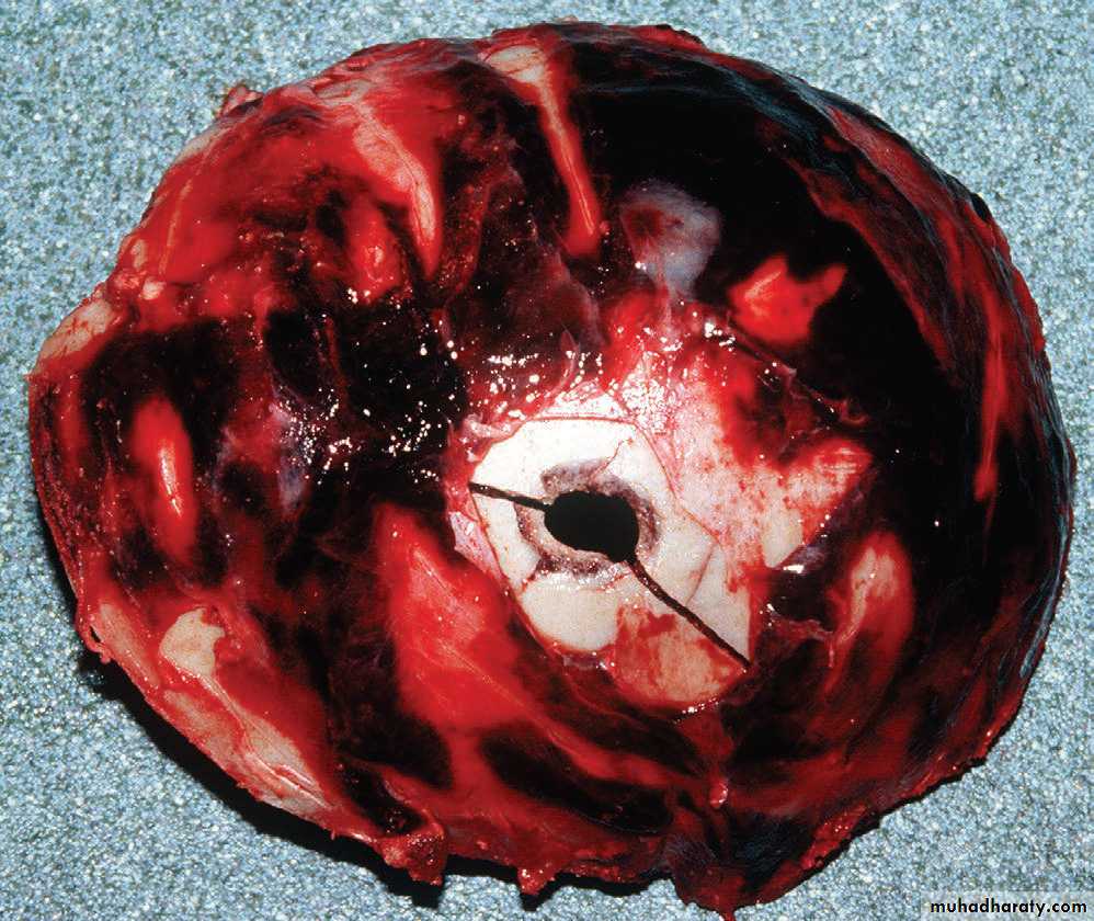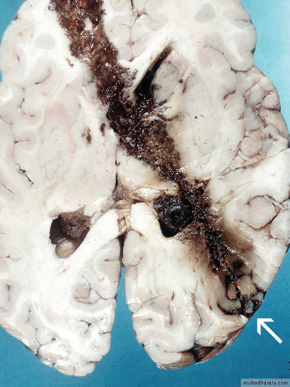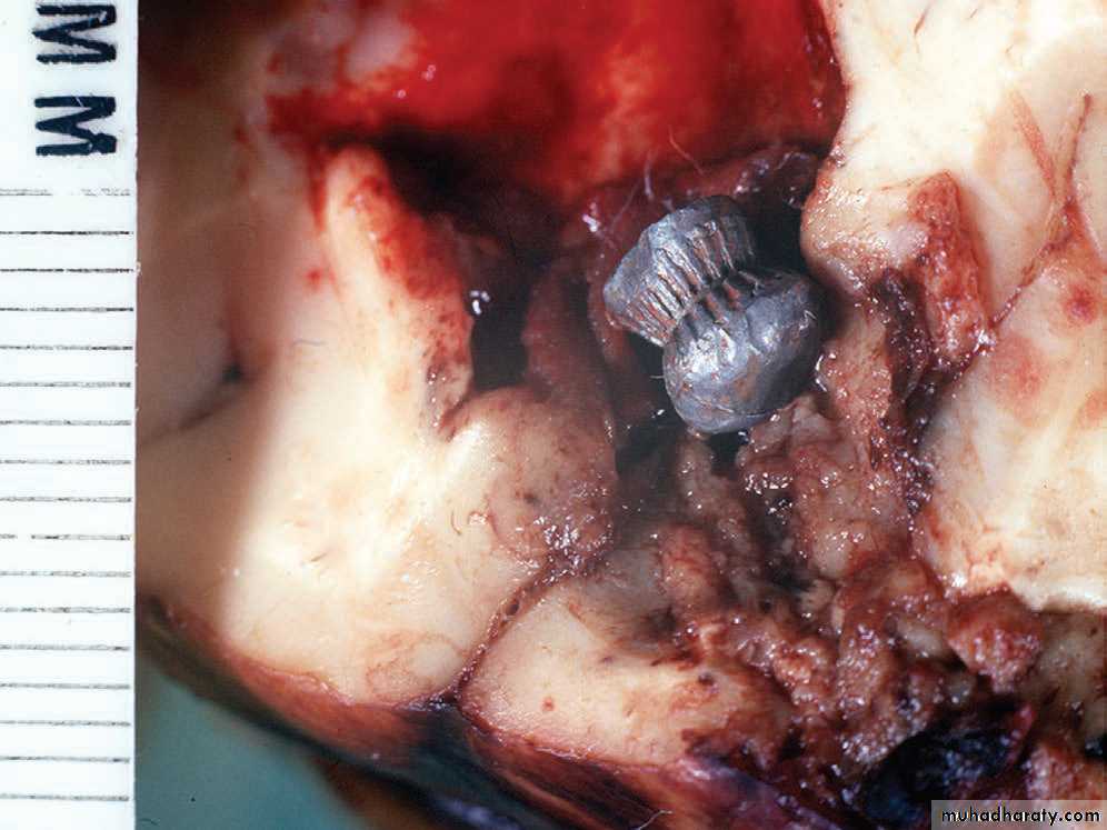 Track through a child’s brain made by a .177 inch air-rifle pellet (arrowed). Although a relatively lowvelocity missile, the track is much wider than the pellet from lateral transfer of kinetic energy.