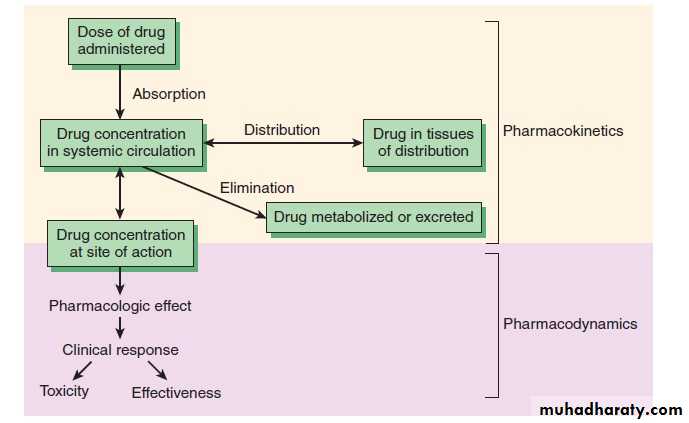 Pharmacodynamics: what the drug does to the body : The study of the biological and therapeutic effects of drugs. Pharmacokinetics: what the body does to the drug: Study of the absorption, distribution metabolism and excretion