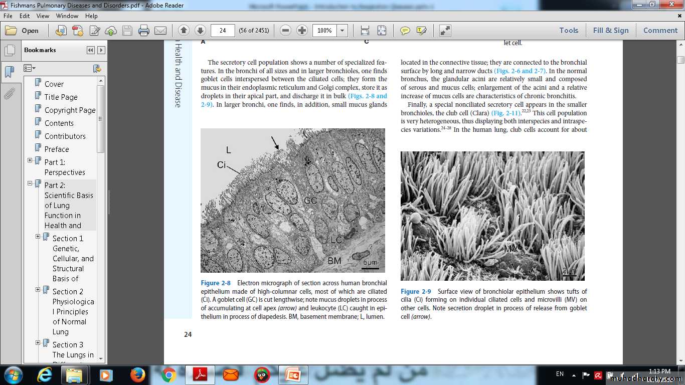 Surface view of bronchiolar epithelium shows tufts ofcilia (Ci) forming on individual ciliated cells and microvilli (MV) onother cells. Note secretion droplet in process of release from gobletcell (arrow).